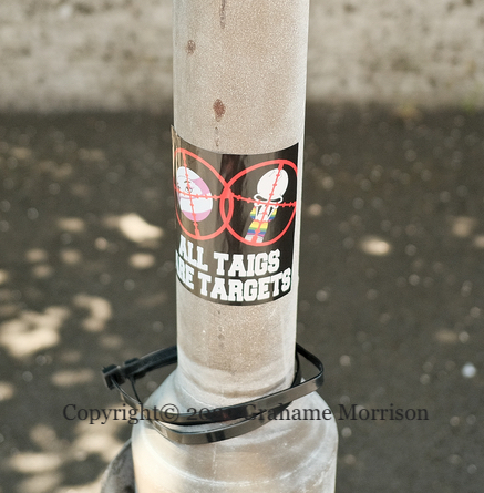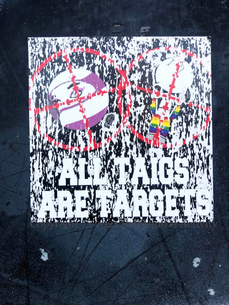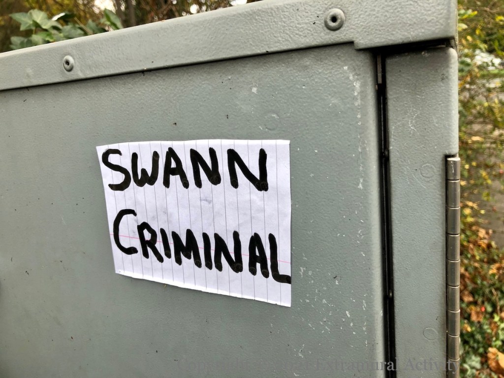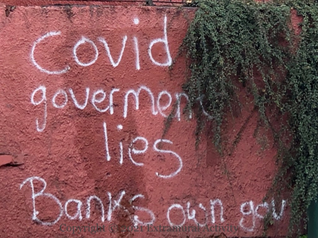 Three images of fringe opinions on the restrictions put in place during the coronavirus pandemic. Above, “Swann [is a] criminal” in (PUL) Cregagh – a reference to Health minister Robin Swann; a Newtownards man was arrested for making threats against Swann (Belfast Live); middle, “The media is the virus – Agenda 2030” in William Street, Londonderry – Agenda 2030 is a set of UN “sustainable development” goals which, to those in the know, is really a plan to enslave humanity, using the pandemic as a cover; last, “Covid gover[n]ment lies – banks own gov” on the Monagh Bypass in (CNR) west Belfast.