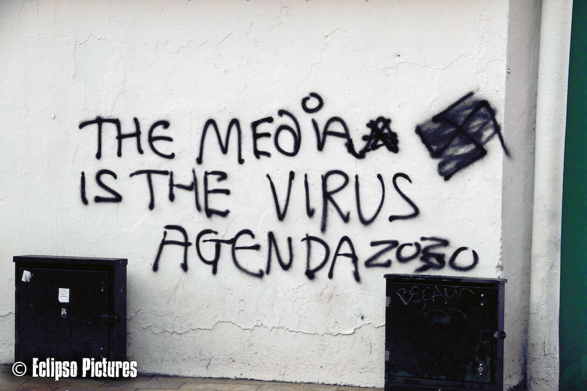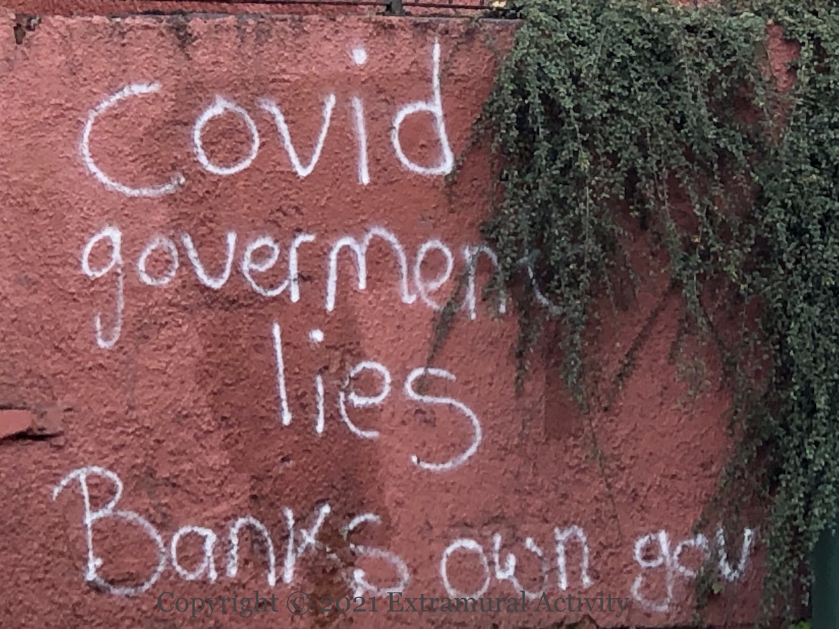 Three images of fringe opinions on the restrictions put in place during the coronavirus pandemic. Above, “Swann [is a] criminal” in (PUL) Cregagh – a reference to Health minister Robin Swann; a Newtownards man was arrested for making threats against Swann (Belfast Live); middle, “The media is the virus – Agenda 2030” in William Street, Londonderry – Agenda 2030 is a set of UN “sustainable development” goals which, to those in the know, is really a plan to enslave humanity, using the pandemic as a cover; last, “Covid gover[n]ment lies – banks own gov” on the Monagh Bypass in (CNR) west Belfast.