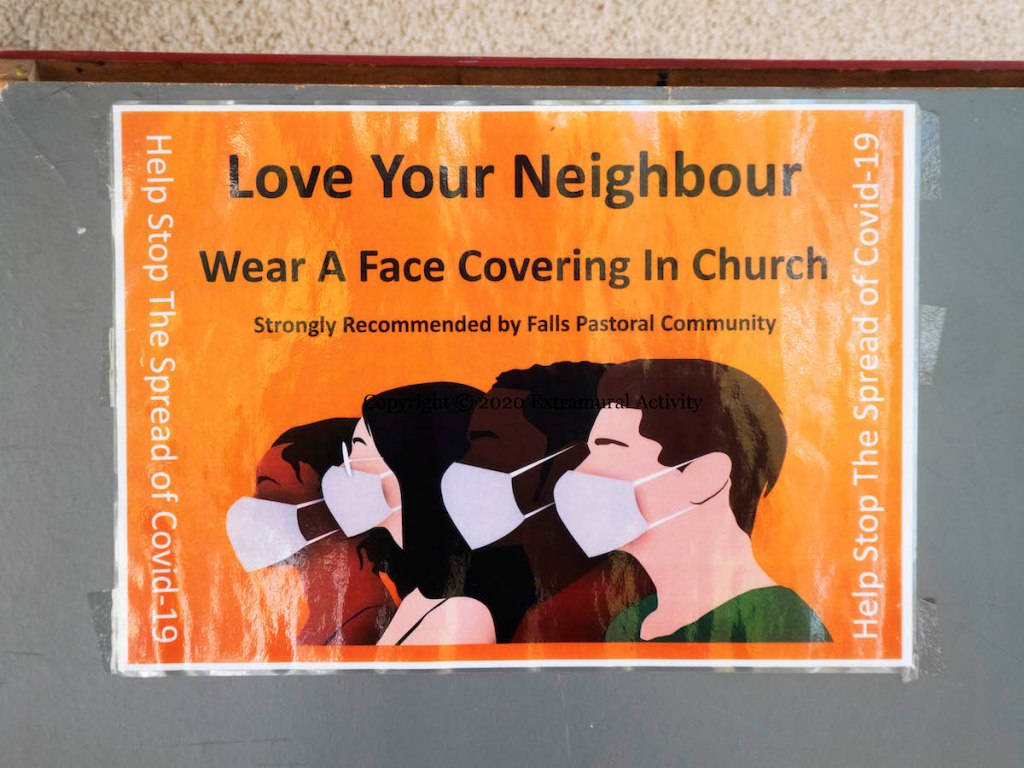 The water has turned into hand sanitiser outside St John’s Catholic church on the Falls Road, opposite the City Cemetery. Admission to services requires booking on-line in advance and wearing a face covering is “strongly recommended by Falls Pastoral Community”.