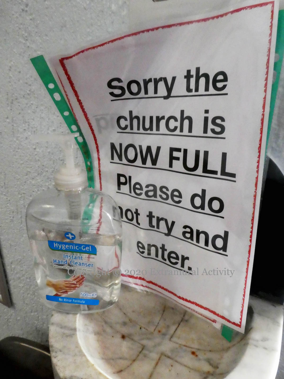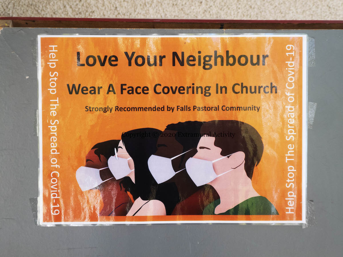 The water has turned into hand sanitiser outside St John’s Catholic church on the Falls Road, opposite the City Cemetery. Admission to services requires booking on-line in advance and wearing a face covering is “strongly recommended by Falls Pastoral Community”.