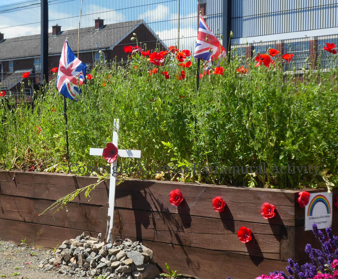 The heroes of the past are the soldiers of WWI and WWII (commemorated by the poppies growing in ACT Initiative‘s Shankill Road Community Garden, above, and in the 75th anniversary VE Day posters in Madrid Street, east Belfast, below); the present-day heroes are the doctors, nurses, and staff of the NHS, symbolised by the rainbow in both images.