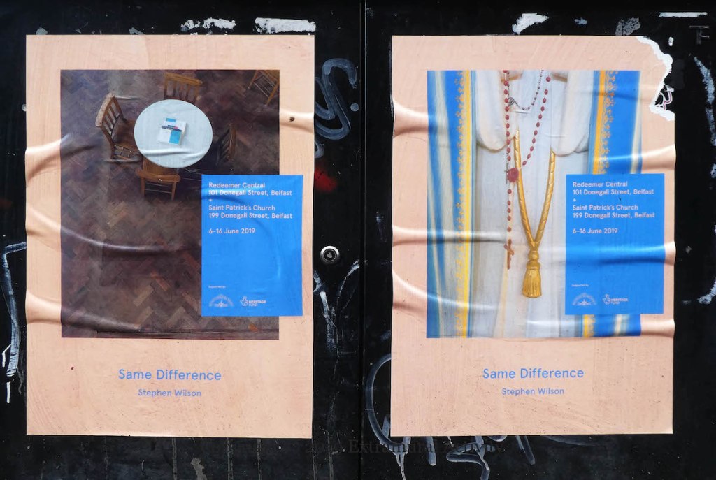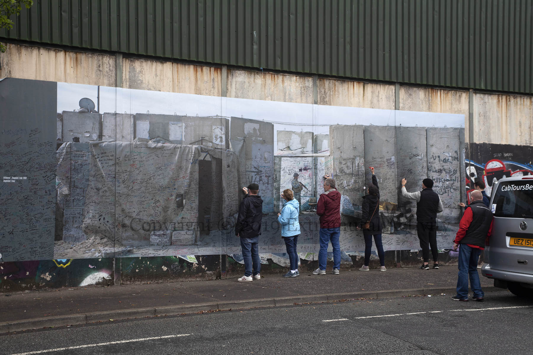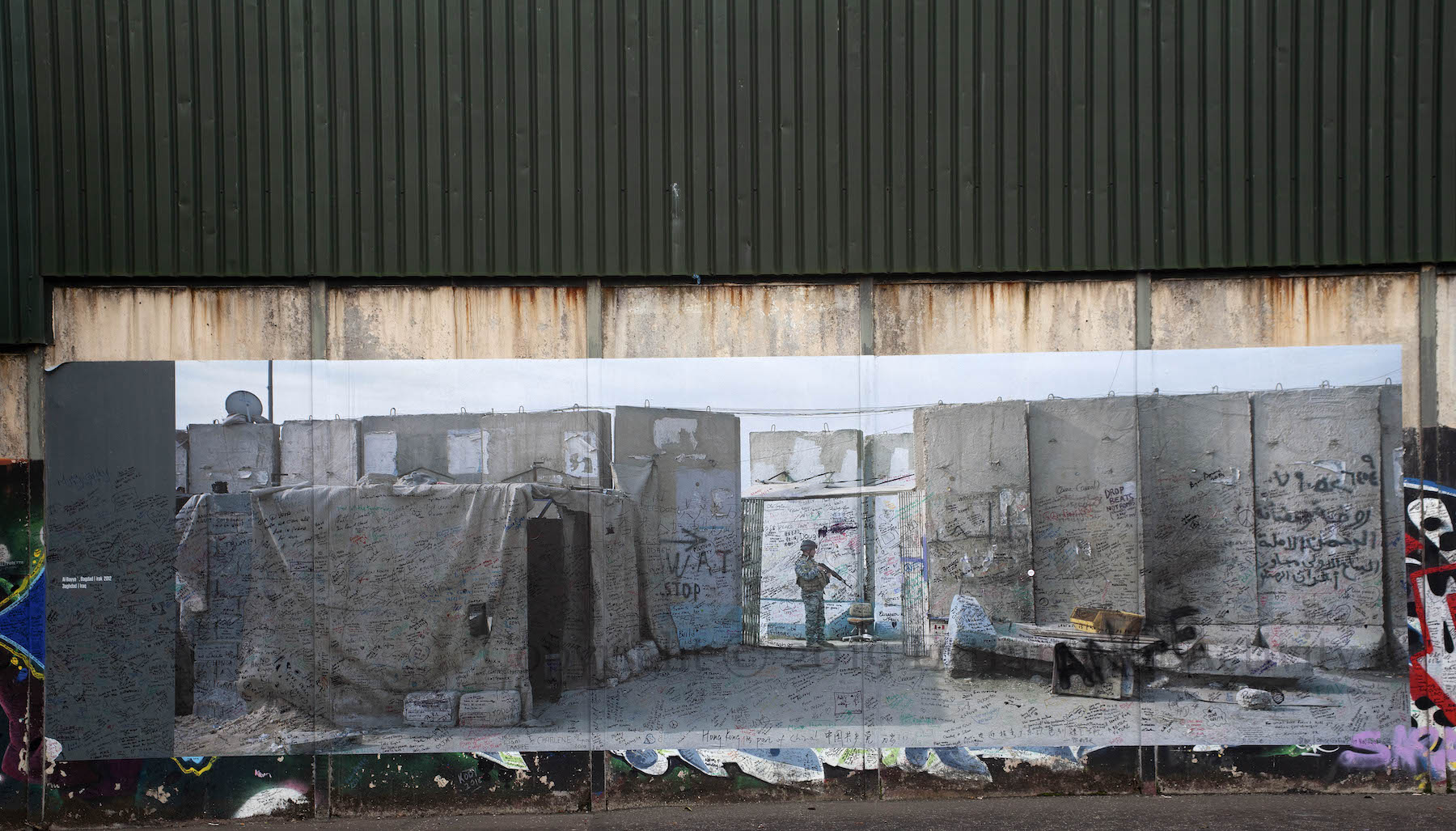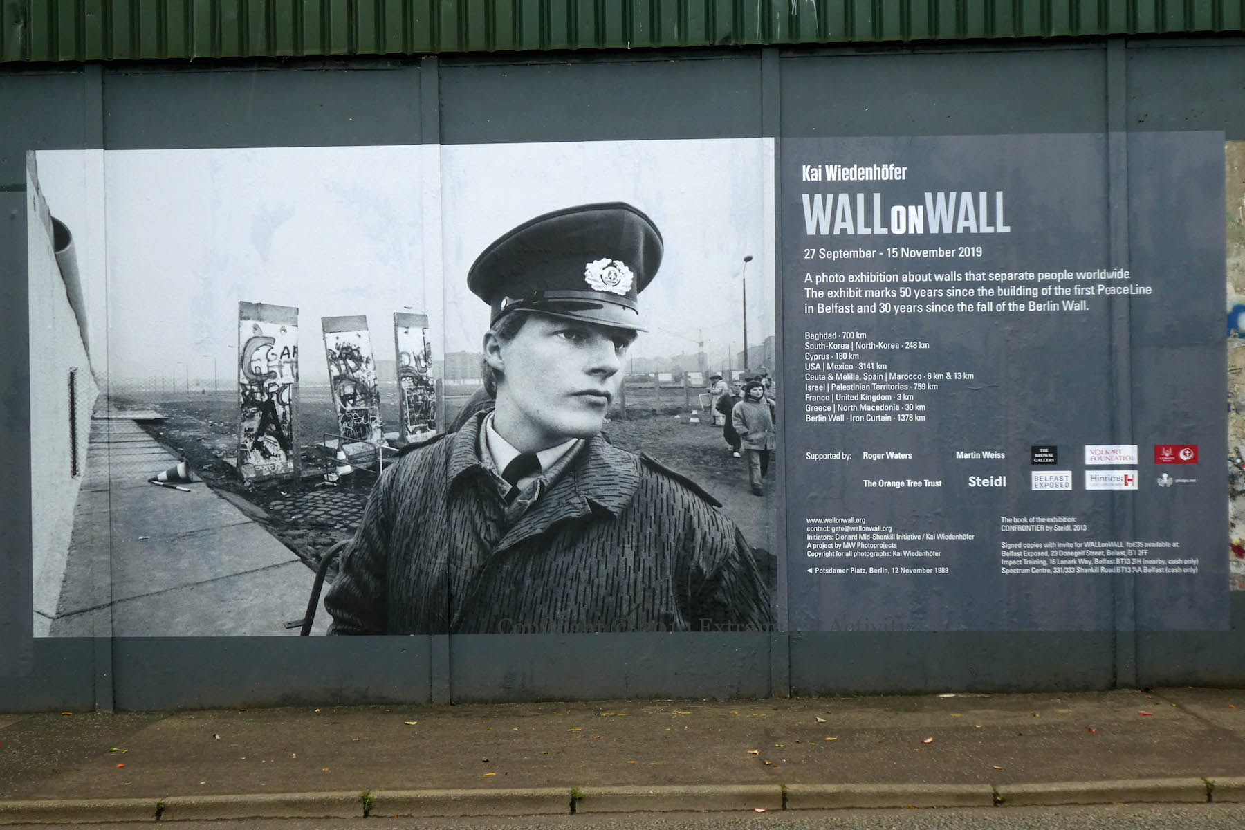 Friday (September 27th) saw the launch of Kai Wiedenhöfer’s ‘Wall On Wall’ exhibition, mounted to coincide with the 50th anniversary of the Cupar Way “peace” line and the 30th anniversary of the fall of the Berlin Wall. On the wall there are 36 images of walls from ten sites across the planet, taken between 1989 and 2018: Baghdad, Korea, Cyprus, USA-Mexico, Spain & Morocco, Israel-Palestine, France-UK, Greece-North Macedonia, Berlin. (His latest book is called Confrontier – the web site includes 53 images.)