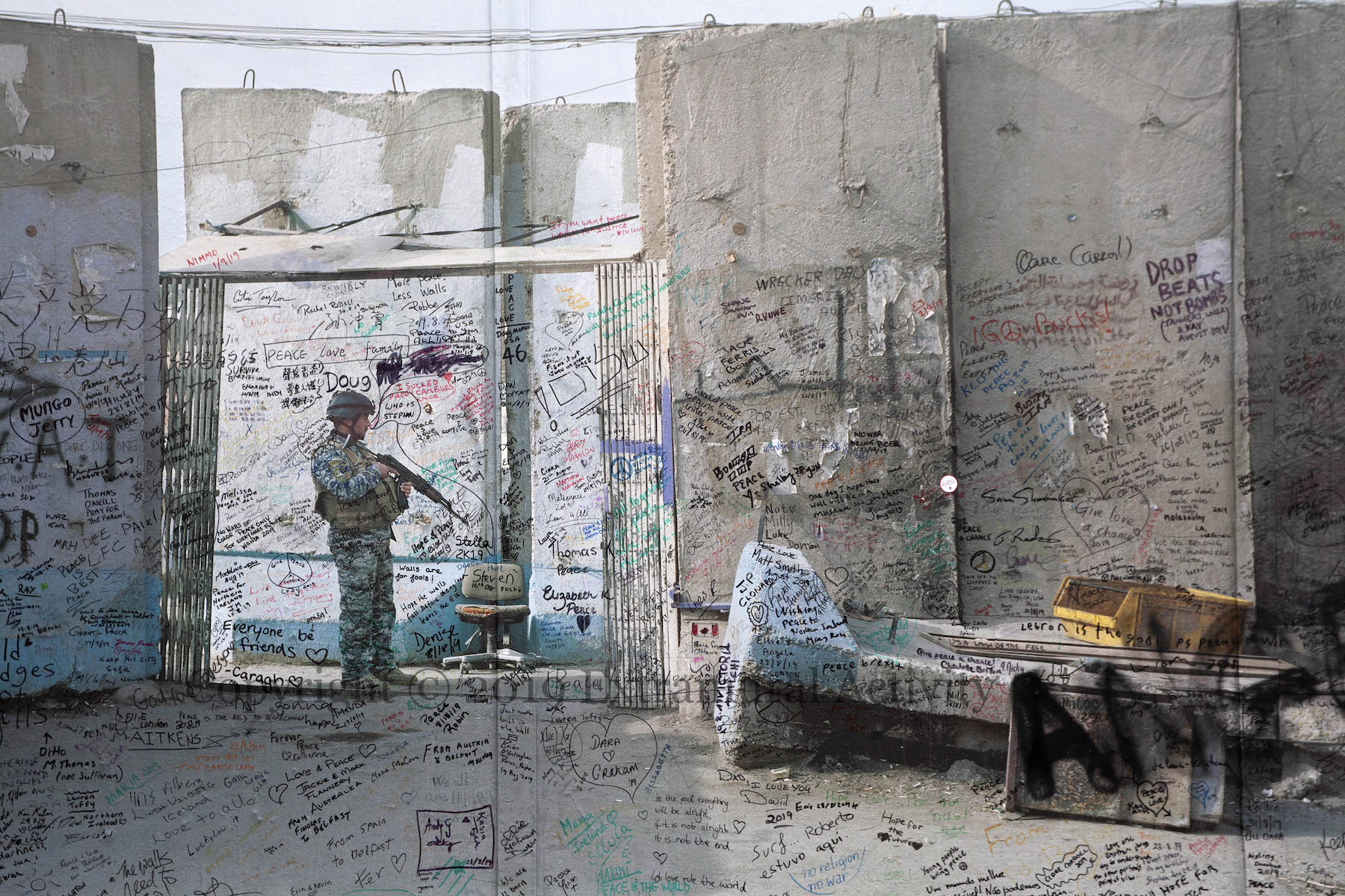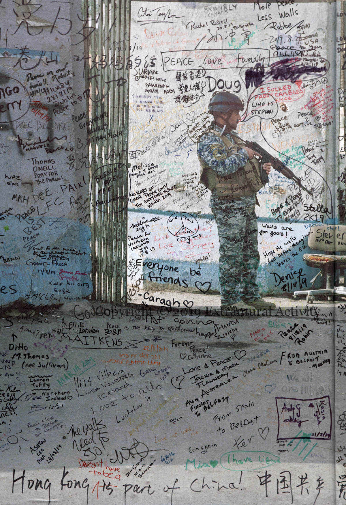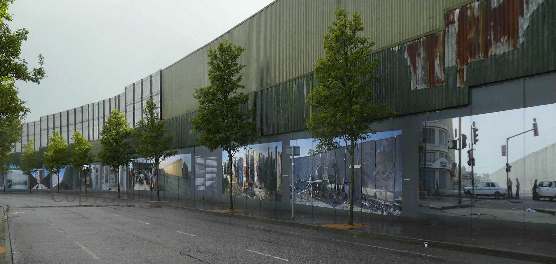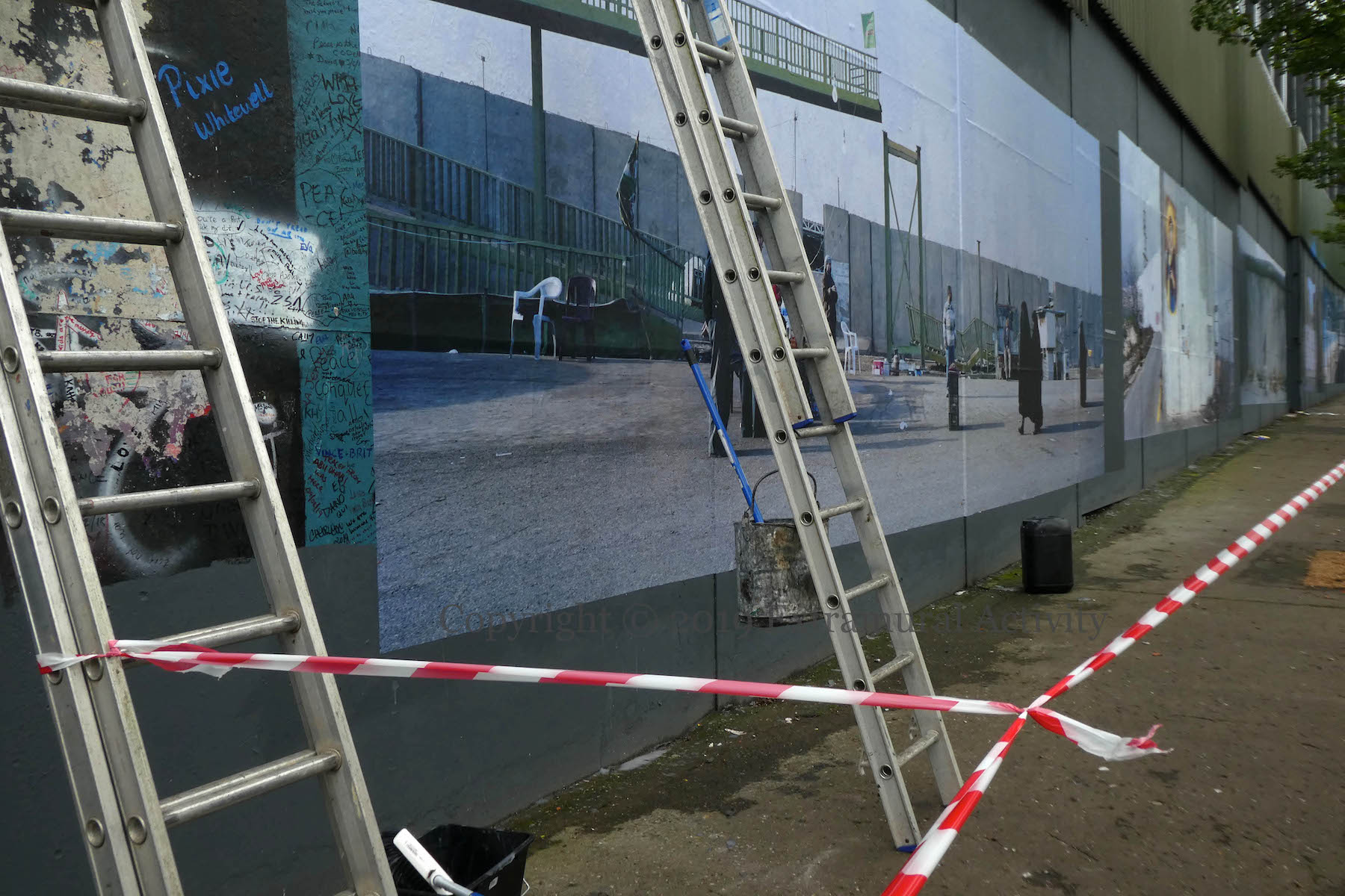 Friday (September 27th) saw the launch of Kai Wiedenhöfer’s ‘Wall On Wall’ exhibition, mounted to coincide with the 50th anniversary of the Cupar Way “peace” line and the 30th anniversary of the fall of the Berlin Wall. On the wall there are 36 images of walls from ten sites across the planet, taken between 1989 and 2018: Baghdad, Korea, Cyprus, USA-Mexico, Spain & Morocco, Israel-Palestine, France-UK, Greece-North Macedonia, Berlin. (His latest book is called Confrontier – the web site includes 53 images.)