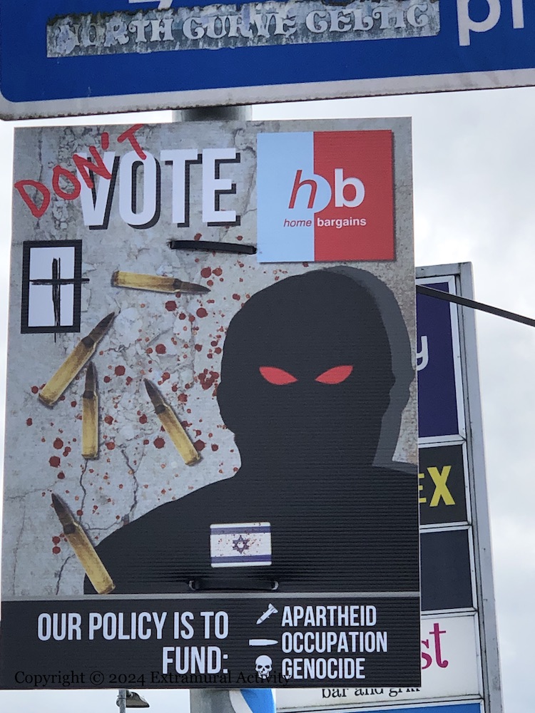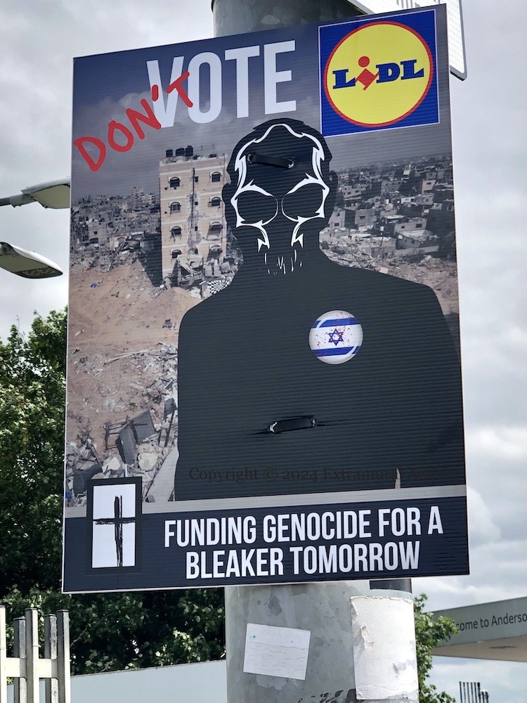 One of Lidl’s slogans (and a “corporate responsibility objective” of the company) is to work “For a better tomorrow”. The electoral-style placard above urges “Don’t vote Lidl” and alleges that the company is “funding genocide for a bleaker tomorrow” and that its “policy is to fund apartheid, occupation, genocide” – perhaps through selling Israeli-made goods – particularly wipes made by Lupilu (ig video | Fb video | Fb | Change.org) – and through its parent company Schwarz’s acquisition of an Israeli cyber-security company.