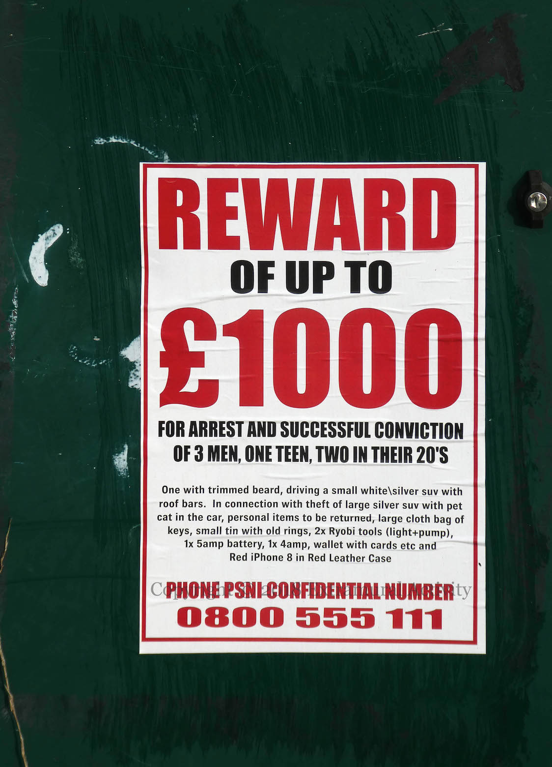 Owners of a silver SUV take their quest for justice to the north Belfast streets by plastering ‘reward’ posters all around seeking the return of wallet, iPhone, tools, and cat.