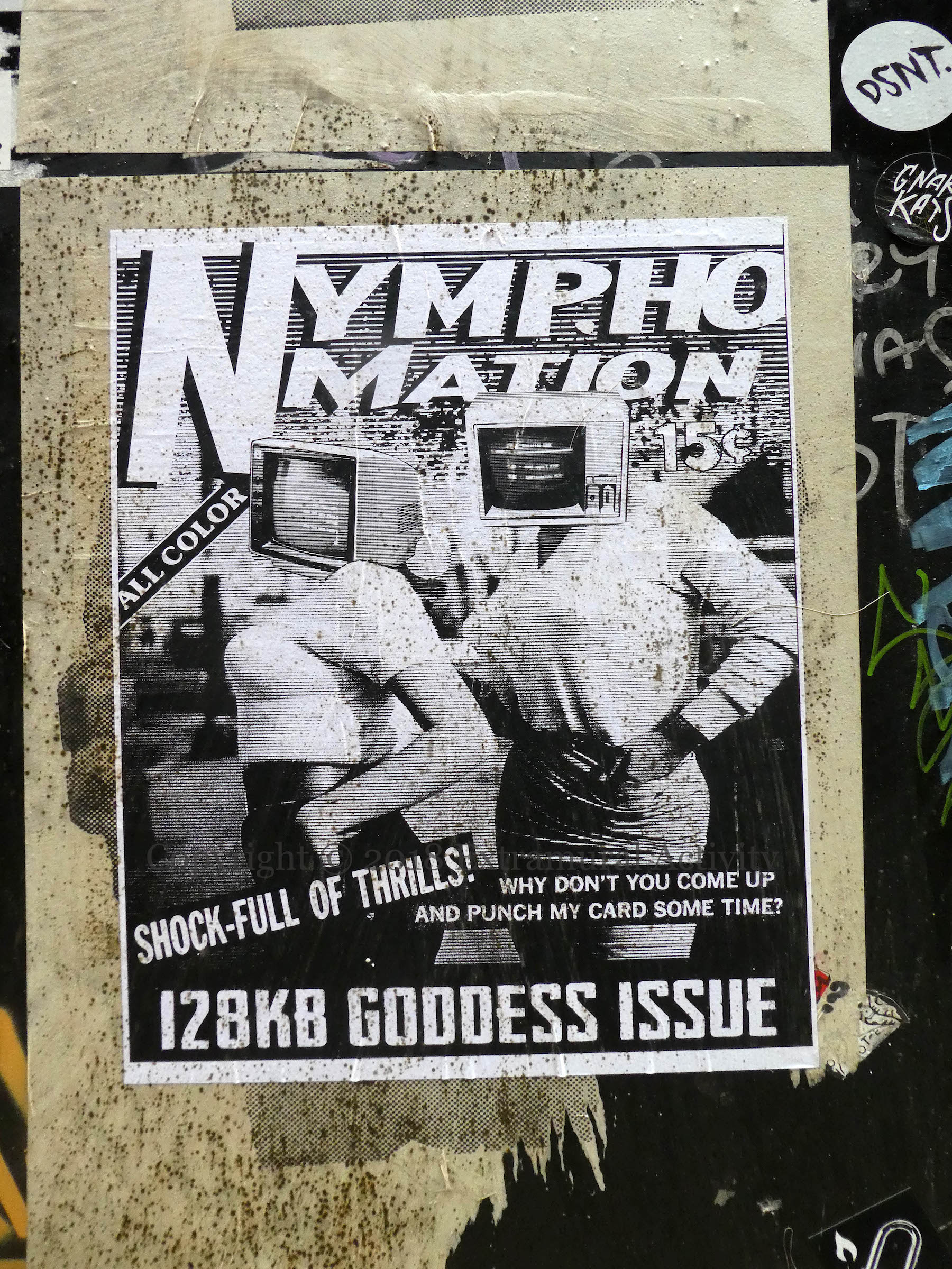 Here’s a recent paste-up from print-maker Leo Boyd (web) combining two of his typical themes: retro pulp magazines and what he calls “tech heads” and “tele heads”. For more schlock-horror, see When Urban Love Goes Wrong. For some tele heads, see Are You A Robot? | She Is My Spy. His latest project is Welcome To The Simulation (tumblr).