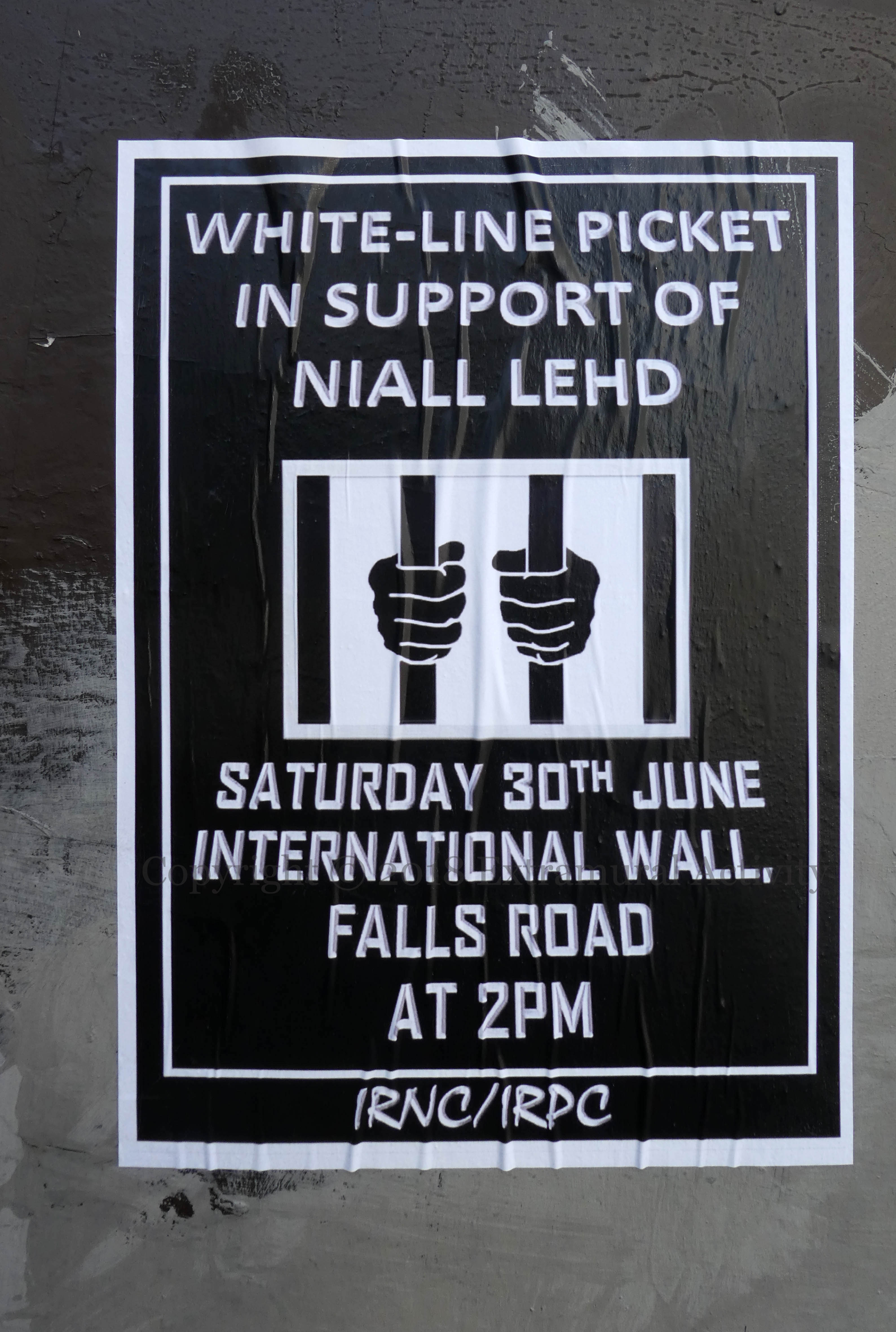 “White-line picket in support of Niall Lehd – Saturday 30th June, International Wall, Falls Road [in fact Divis Street] at 2 pm”. For details of his incarceration, see Free Niall Lehd. This IRNC/IRPC poster is in the New Lodge (Join The IRNC | IRPC).