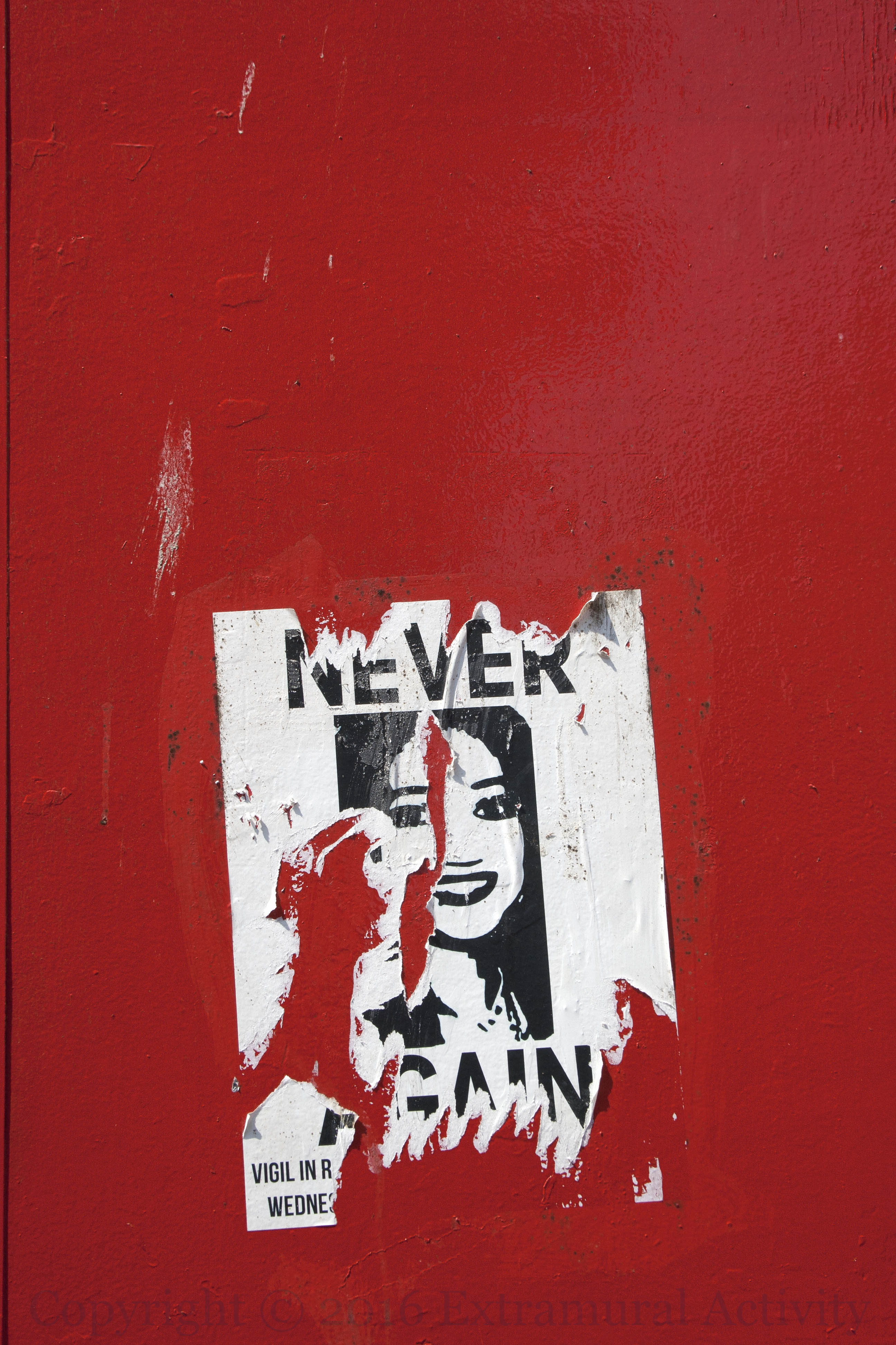 This is an old poster (dating to November 2012) still visible in Castle Street, calling for a march and vigil in remembrance of Savita Halappanavar, a 31-year-old Indian dentist living in Galway, who died from a septic miscarriage after being denied an abortion.