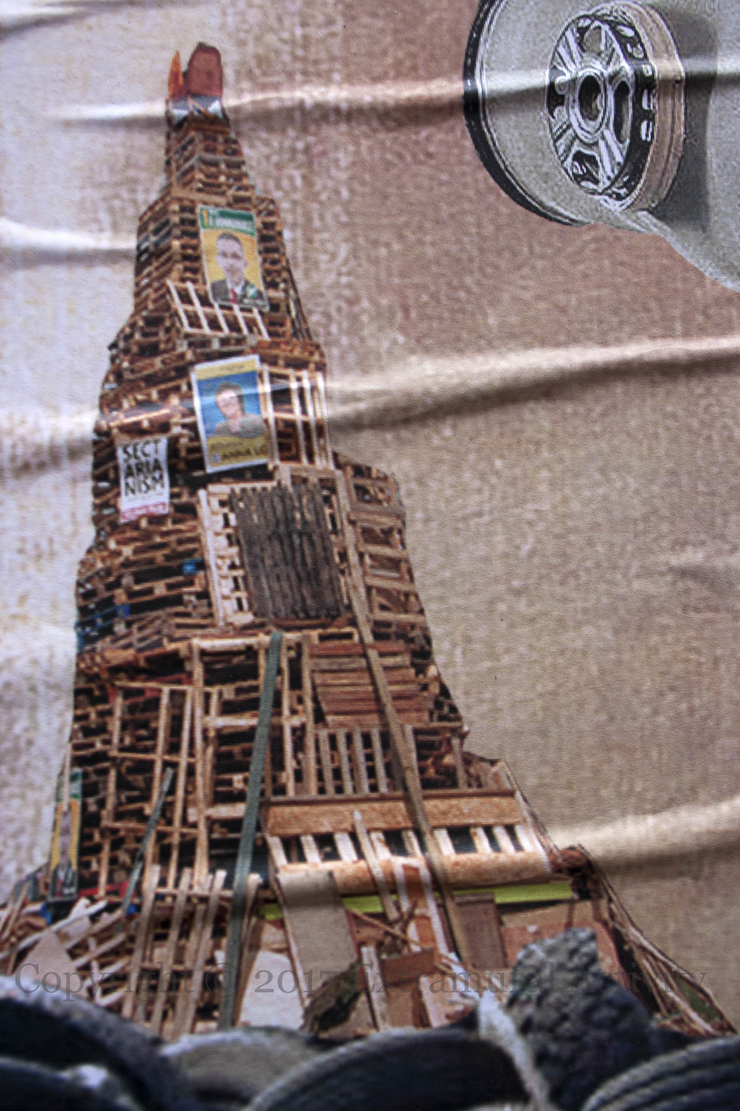 New work (presumably) by TLO in Belfast city centre showing King Billy (and horse!) wearing a gas mask as he rides over a river of tyres piled up for burning on bonfires. (The original painting is in the Royal Museums Greenwich). The practice of burning tyres has been controversial over the last few years as it is thought to cause toxic fumes. A collection of tyres was removed from Connswater in mid-March (Tele).