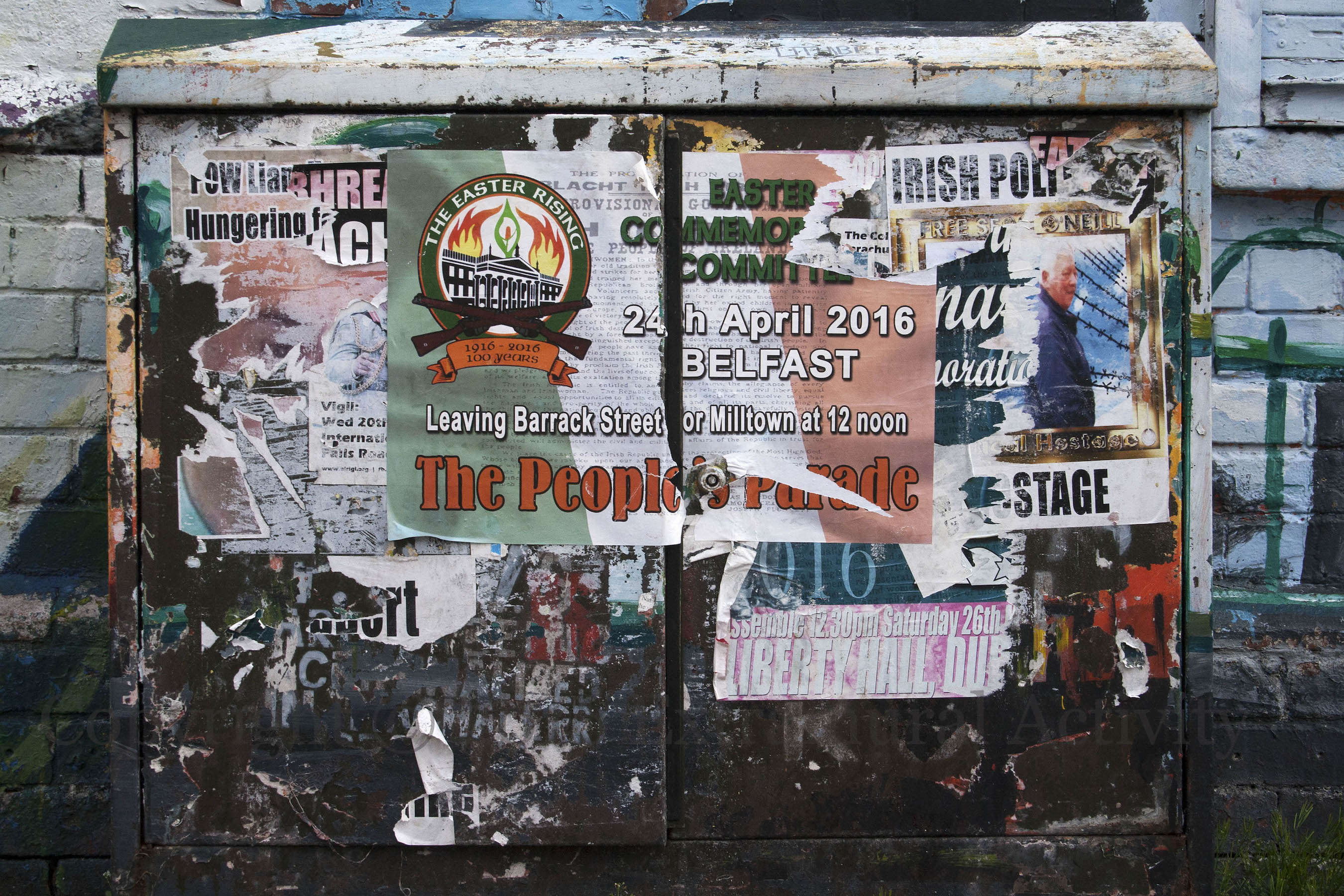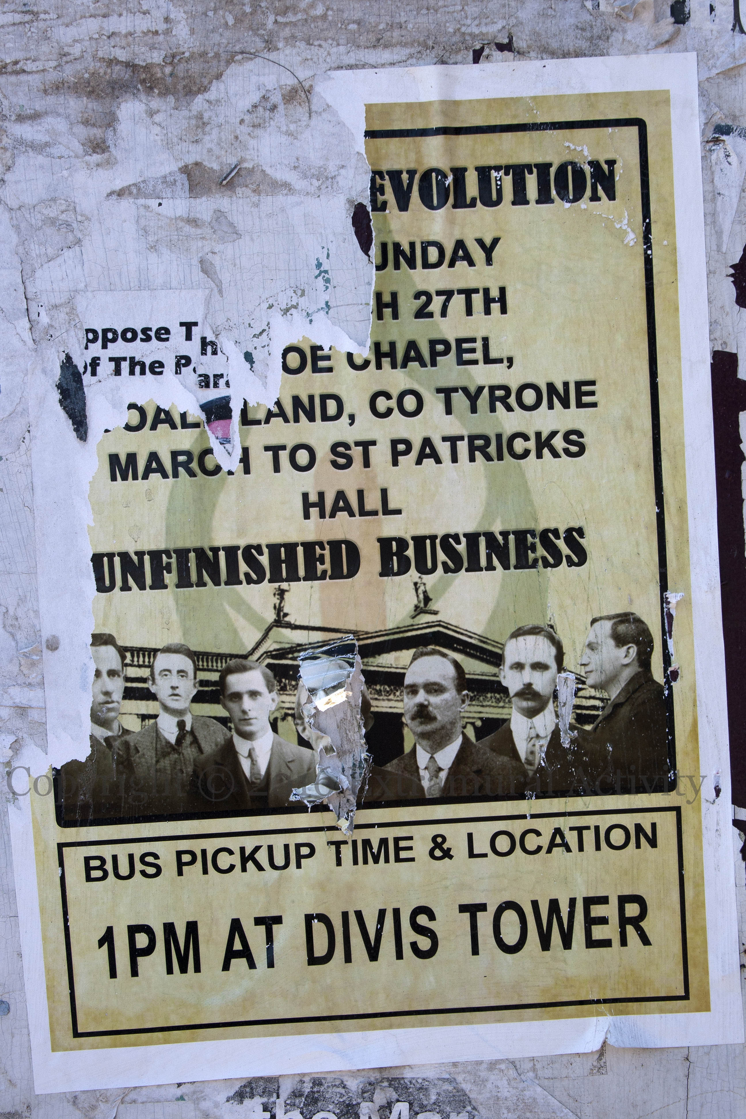 Another “Lá Dearg” – organised by An Dream Dearg (the red group) takes place next Saturday with a march from An Cultúrlann to the city hall. The image above shows graffiti in Divis Street; the image below shows posters for the event on the Lıú Lúnasa mural.