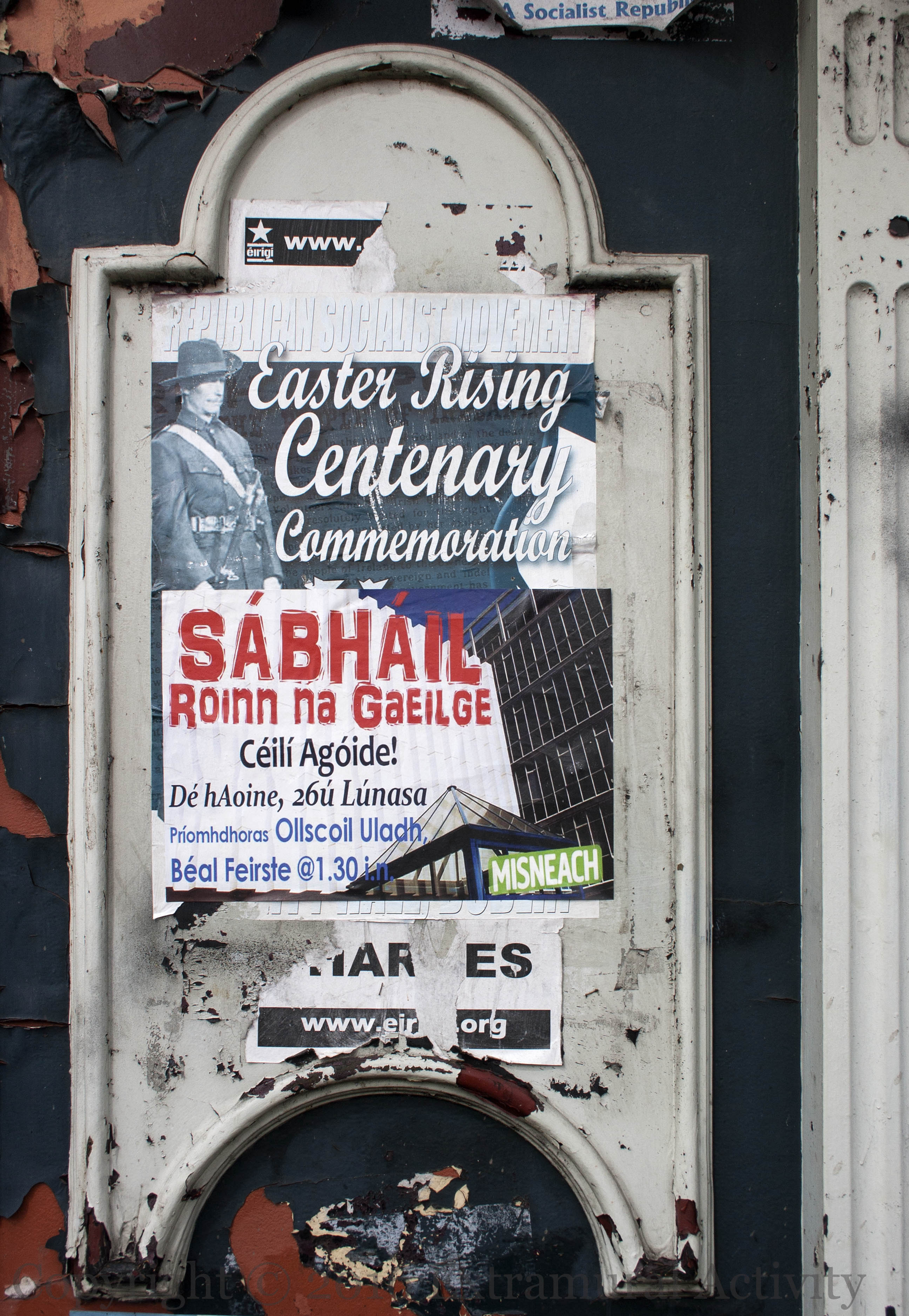 A variety of posters for marches in Easter week: on the 14th, Saoradh’s call for a counter-protest to the march by former soldiers against prosecutions for deaths during the Troubles (see e.g. Irish News); on the 16th, an Easter Rising commemorative march, somehow associated with the IRA’s D Company; on the 17th (see the final image, below), an Easter Rising commemoration in Derry, organised by Saoradh (and on the 30th – also in the final image below – a commemoration for “Óglach Teddy Campbell”).