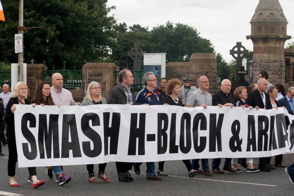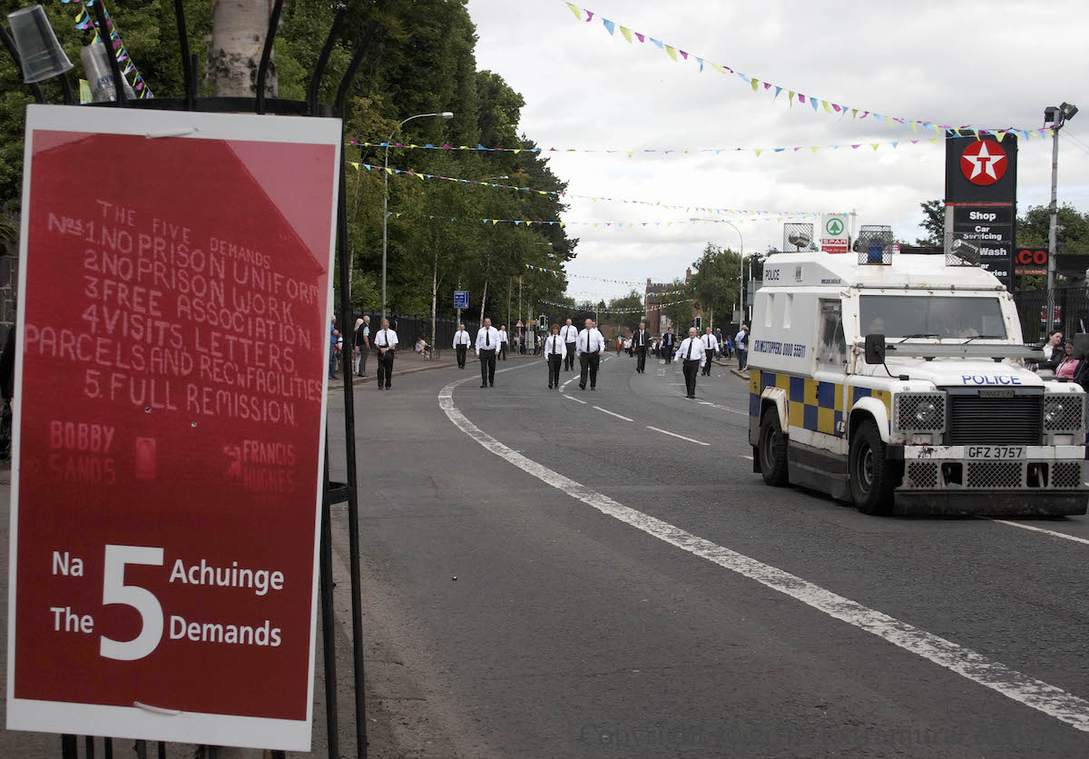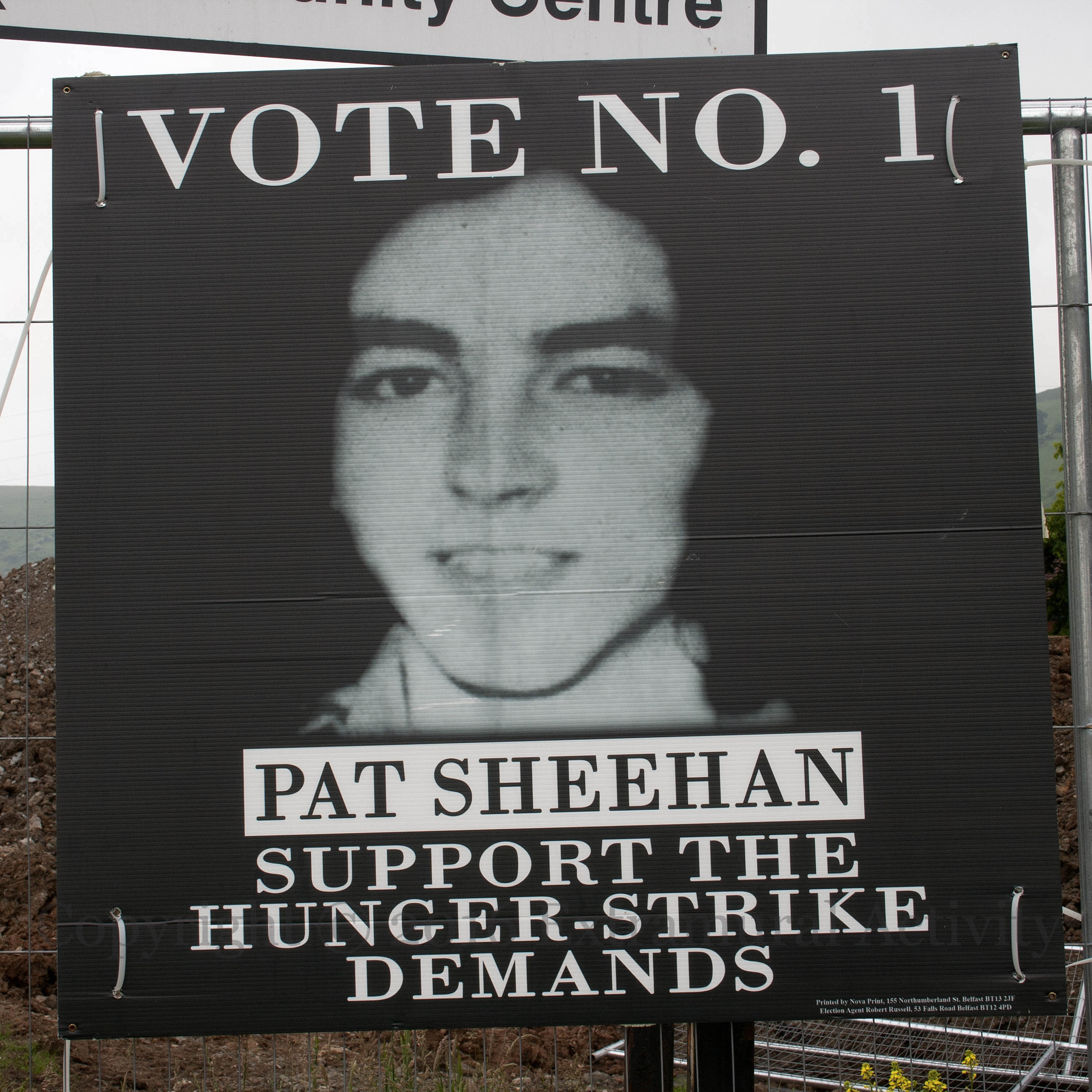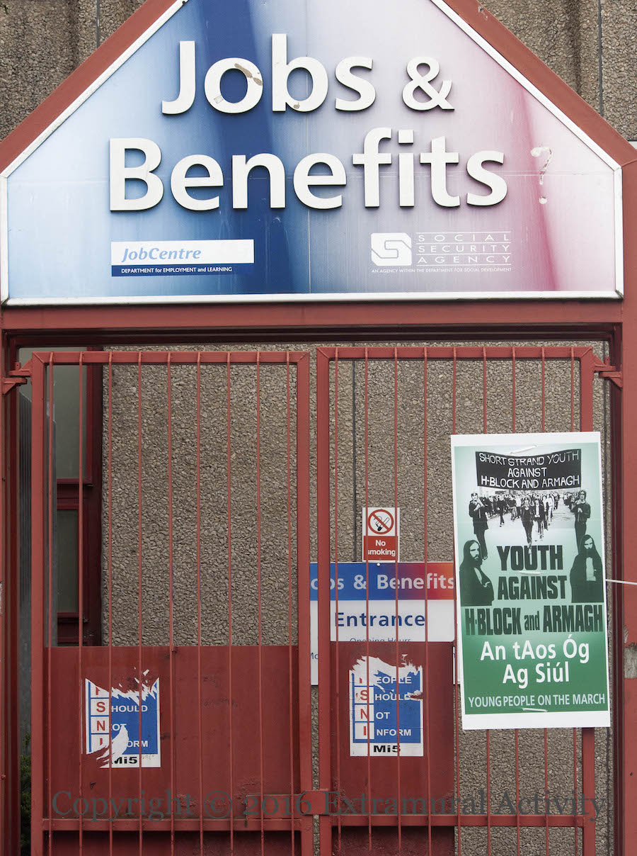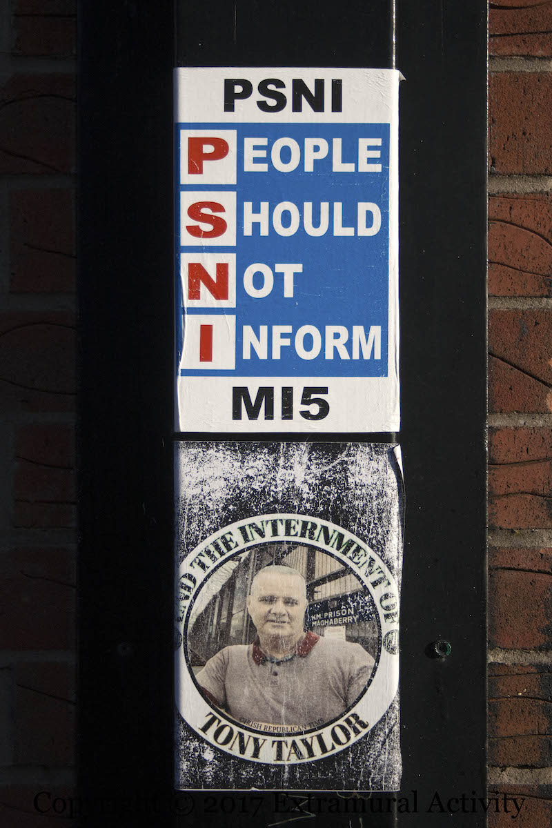 More ‘people should not inform’ PSNI posters (and a large board in Thames Street, shown below) from the IRPWA (Irish Republican Prisoners Welfare Association) including the arrest of Padraig McShane, along with one demanding “Political status now” with a raised fist grasping barbed wire.
