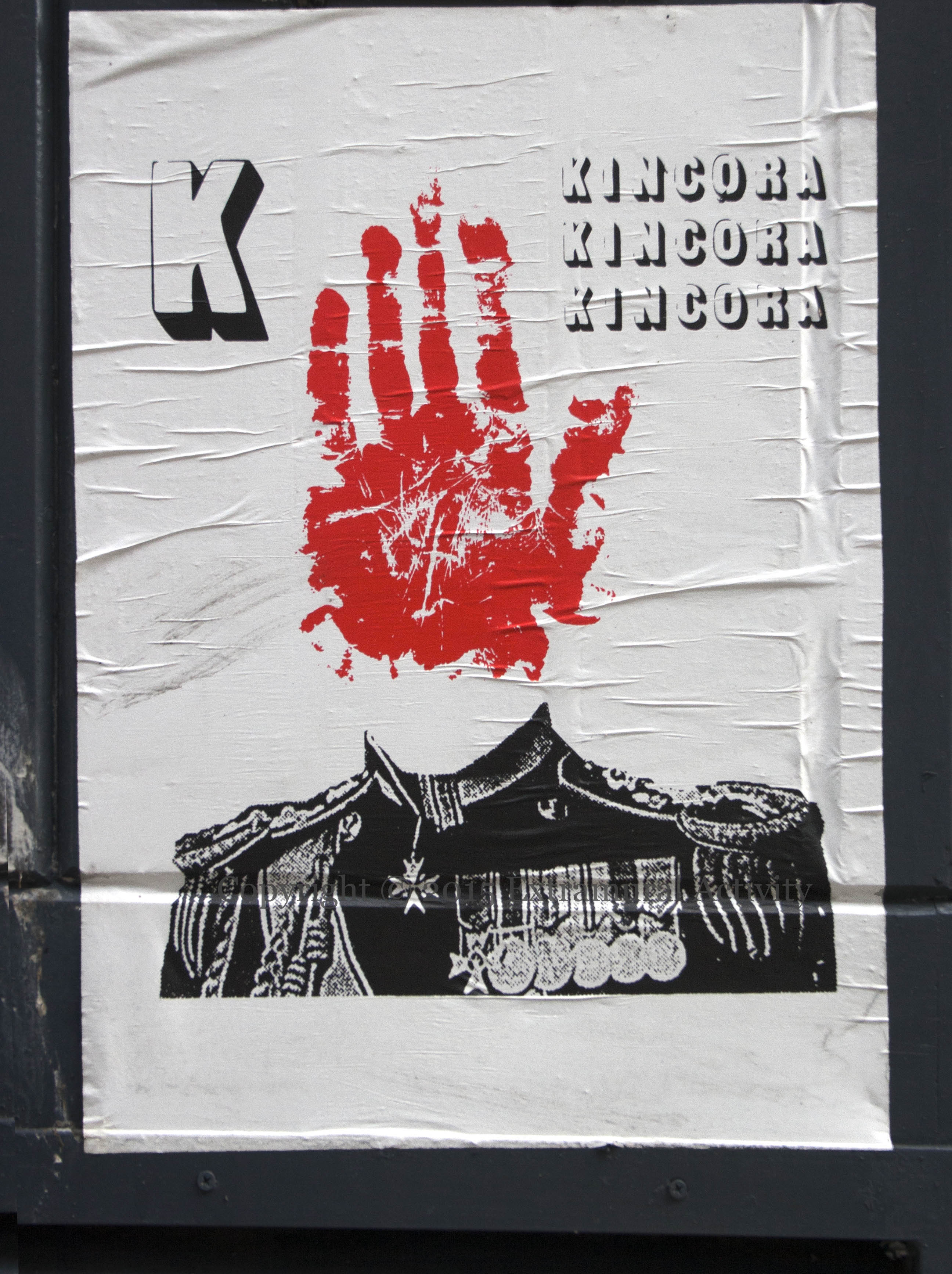 The work above by TLO (featured previously in Demonizing Paisley, Three Studies Of Ian Paisley, Ian Jong-un, and Wee Angel) comments on the long-running inquiry (or inquiries) into abuse at the Kincora boys home. Despite the conviction of several workers as a result of a 1980 RUC inquiry, the matter continues to resurface, with involvement alleged against British lords and notables, MI5, and loyalist paramilitaries. In the latest development, an appeal by campaigners to have Kincora included in the UK-wide sexual abuse inquiry was rejected (BBC-NI). In the poster above, a bloody red hand takes the place of the head above Mountbatten’s regimental uniform (see the photo below).