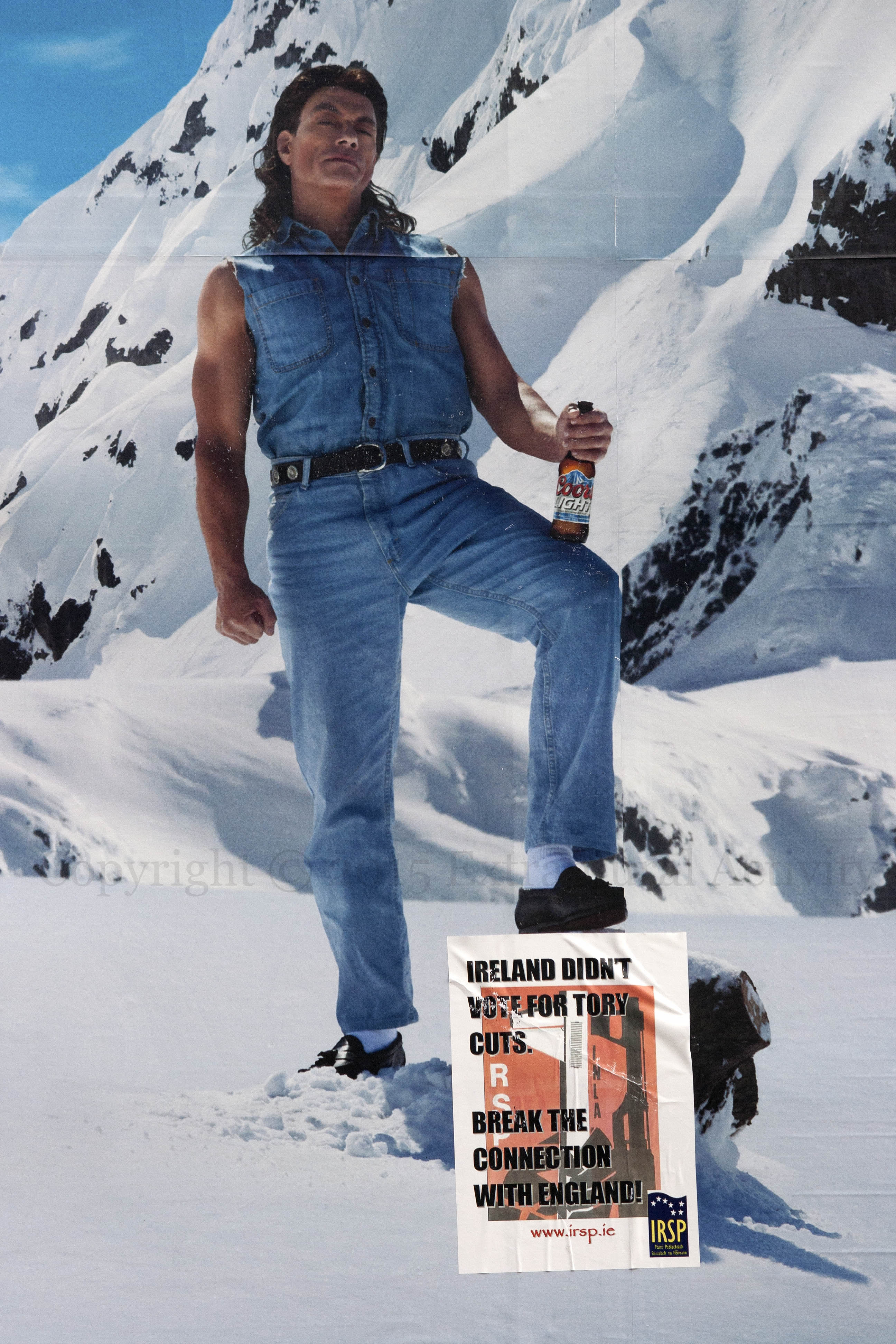 A Coors Light “Closer to Cold” ad, with Jean-Claude Van Damme on a snowy mountain in jeans and loafers with his foot on a snowy tree-stump, is co-opted by the IRSP: “Ireland didn’t vote for Tory cuts — Break the connection with England!”