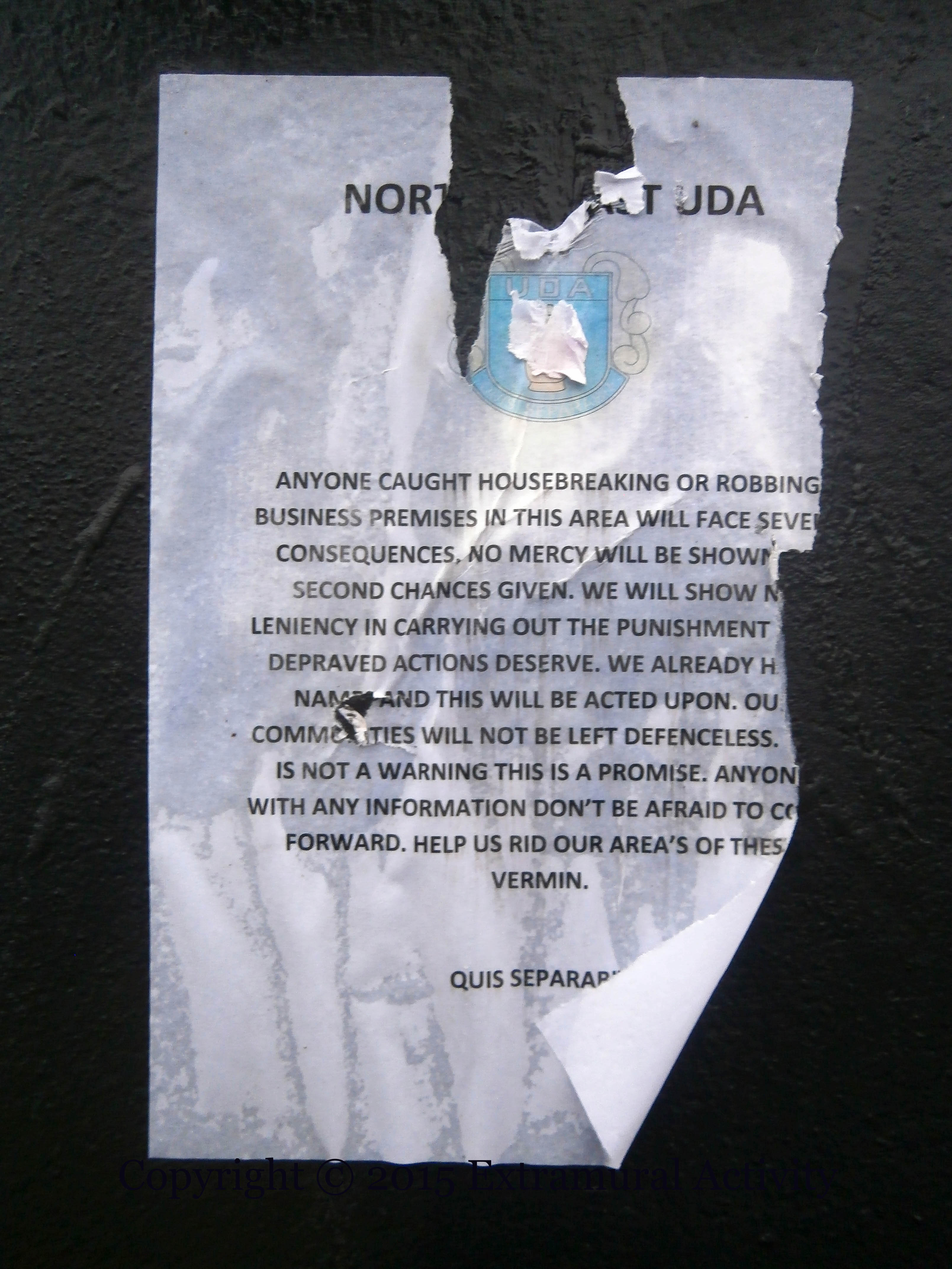 “North Belfast UDA: Anyone caught housebreaking or robbing business premises in this area will face severe consequences. No mercy will be shown or second chances given. We will show no leniency in carrying out the punishment your depraved actions deserve. We already have names and this will be acted upon. Our communities will not be left defenceless. This is not a warning this is a promise. Anyone with any information don’t be afraid to come forward. Help us rid our area’s of these vermin. Quis separabit.”