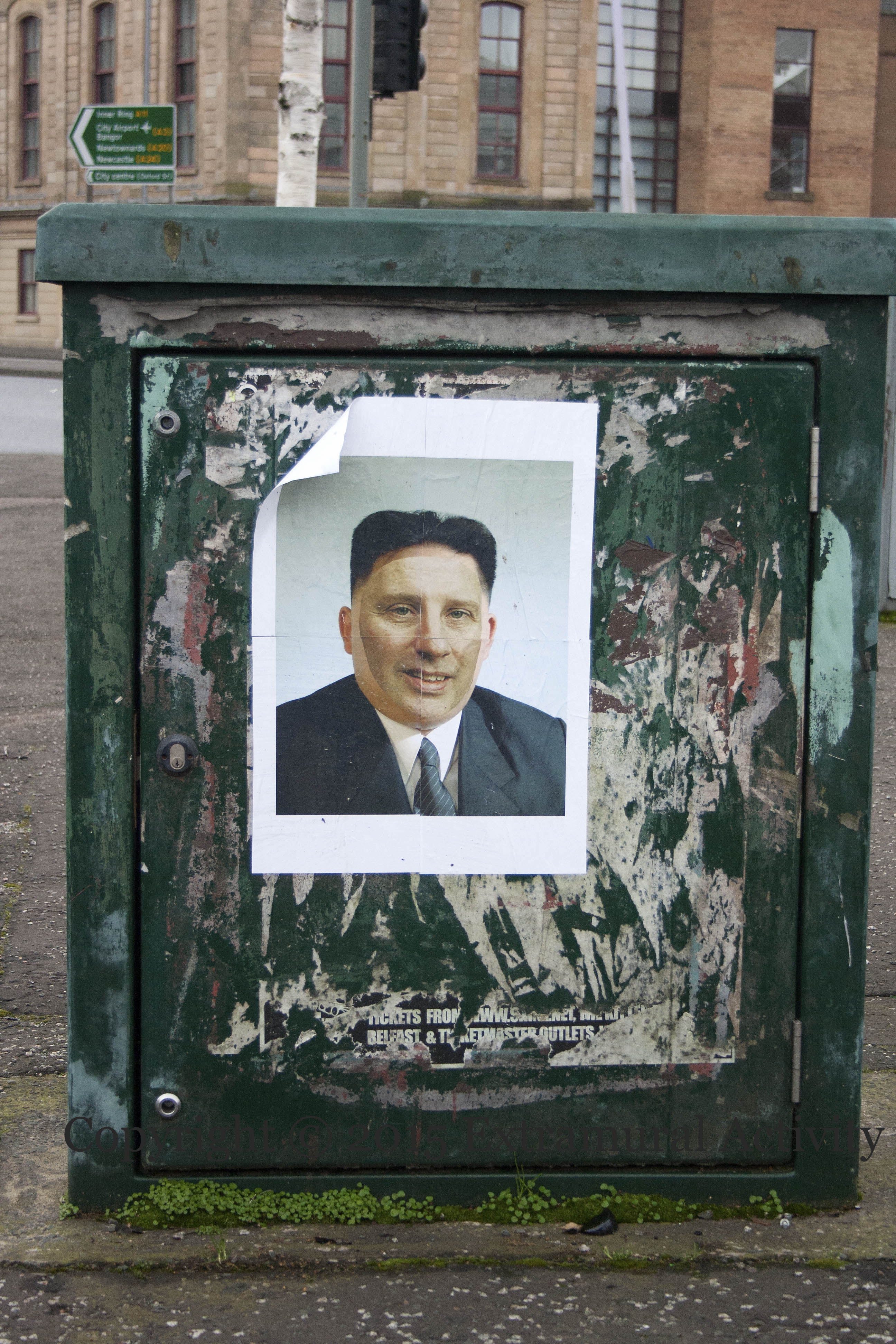 Here are two shots of the mash-up which has appeared in various city-centre locations, of Ian Paisley Jr’s visage superimposed on the bust of Kim Jong-Un. The first (above) is at the junction of Corporation St and Dunbar Link; the second (below) is in Hill Street, and is pasted over the torn remains of the previous generation of Paisley paste-up: Ian senior with a face filled in with the harp-side of pre-Euro Irish coins (see TLO’s “Doctored Paisley” web-site). For other versions of last year’s Paisley posters, see: Three Studies Of Ian Paisley | Demonizing Paisley