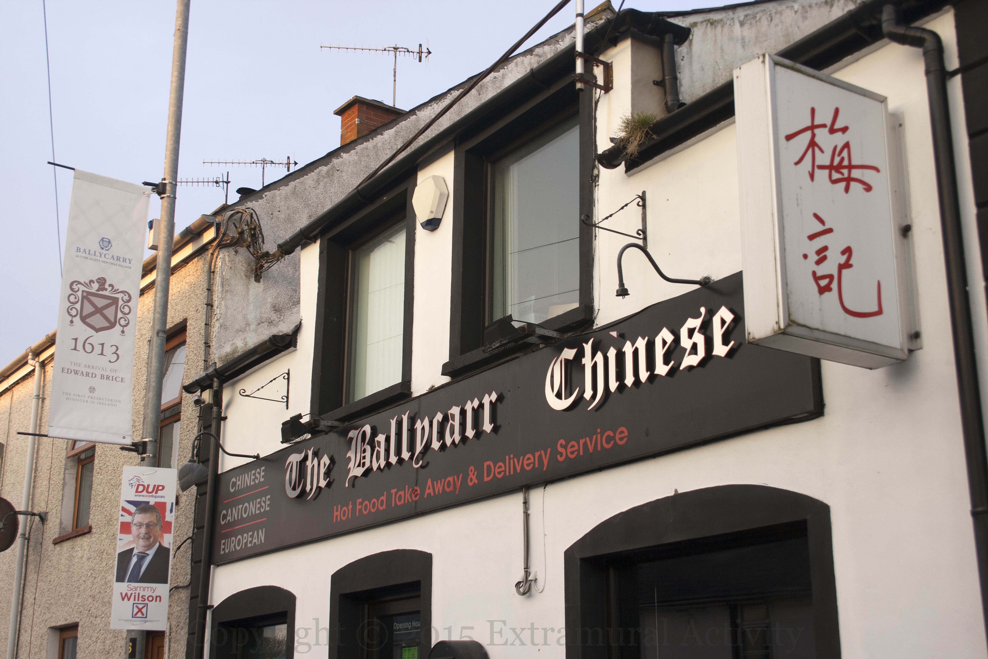 Chinese, Cantonese, European, and Presbyterian. Three signs outside the Chinese take-away in Ballycarry: the Chinese lettering for the restaurant, a DUP poster supporting Sammy Wilson, and an Ulster-Scots heritage banner: “1613 The Arrival of Edward Brice – The first presbyterian minister in Ireland”.