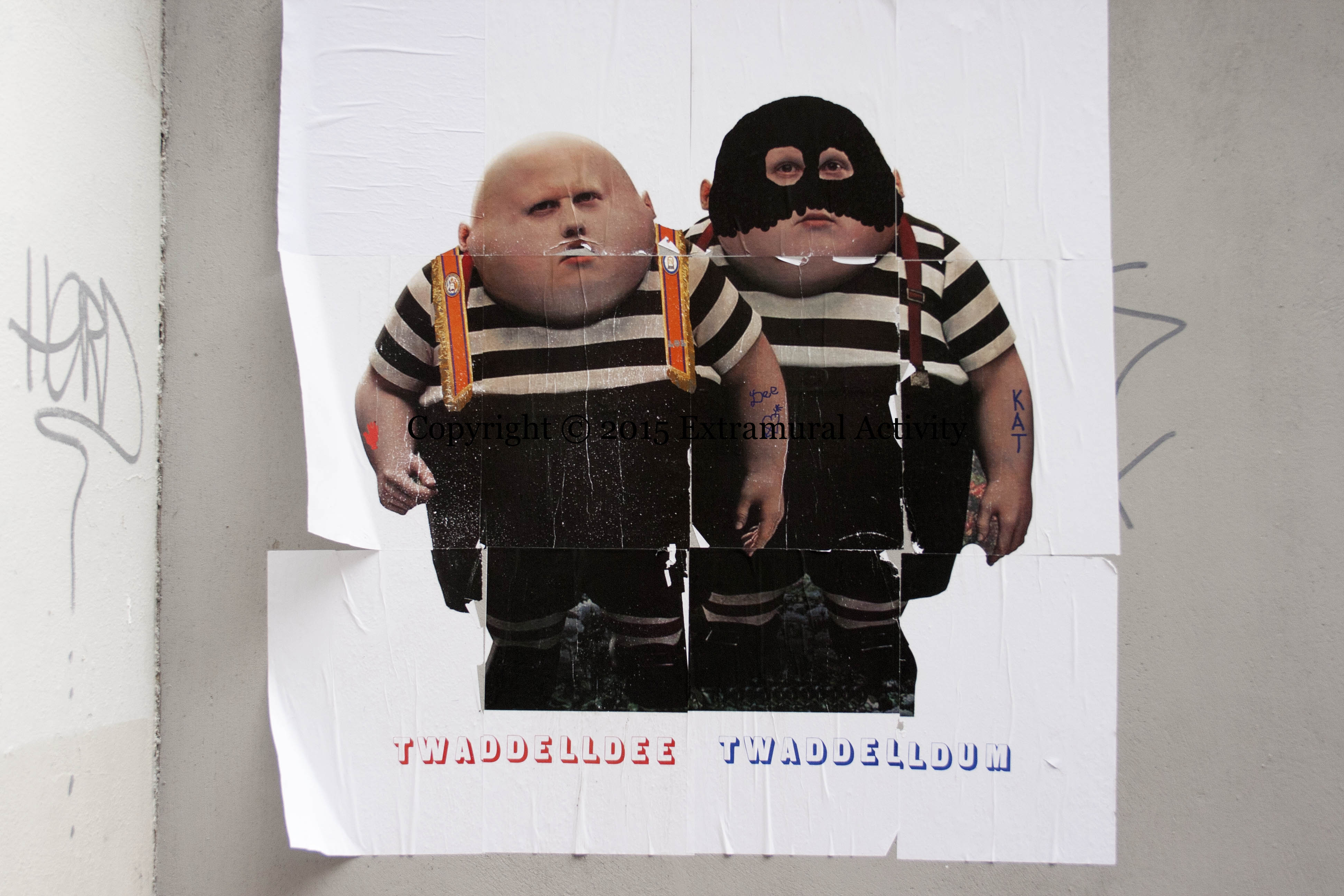 Lewis Carroll’s Tweedledee and Tweedledum (as imagined by Tim Burton for Disney) have been turned into Twaddelldee and Twaddelldum, Twaddelldee using an Orange collarette as braces and Twaddelldum with face-mask, concealed brick, and “KAT” tattoo. The protest at Twaddell Avenue continues, after more than 600 days. For background, see previously: Protest Camp | Civil Rights Camp | Supporters Club | No Surrender