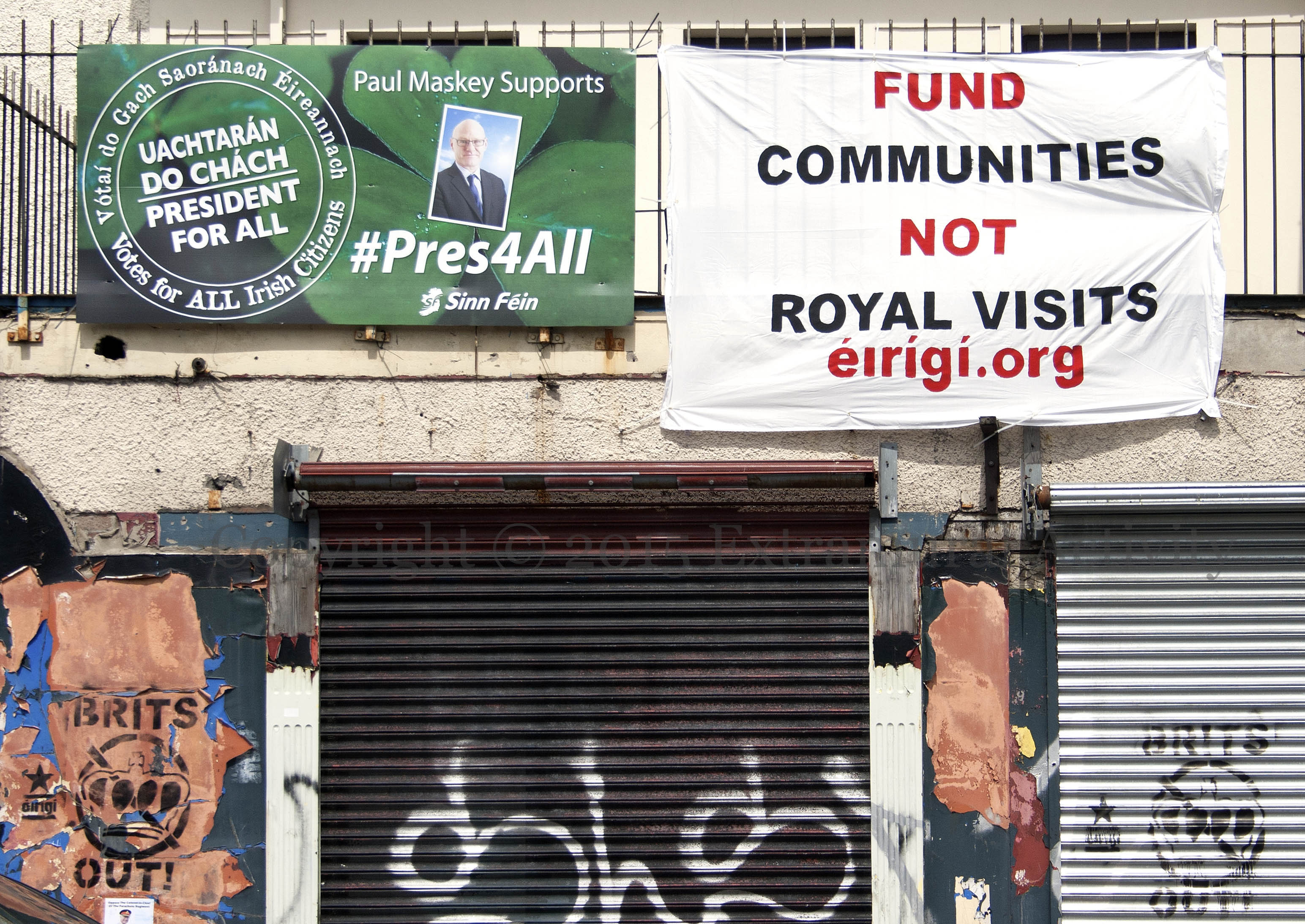 The Sınn Féın board to the left is from their campaign to extend voting in the Irish Presidential election to the north: “Vótaí do gach saoránach Éireannach”, “Paul Maskey supports #pres4all – Uachtarán do chách/President for all”