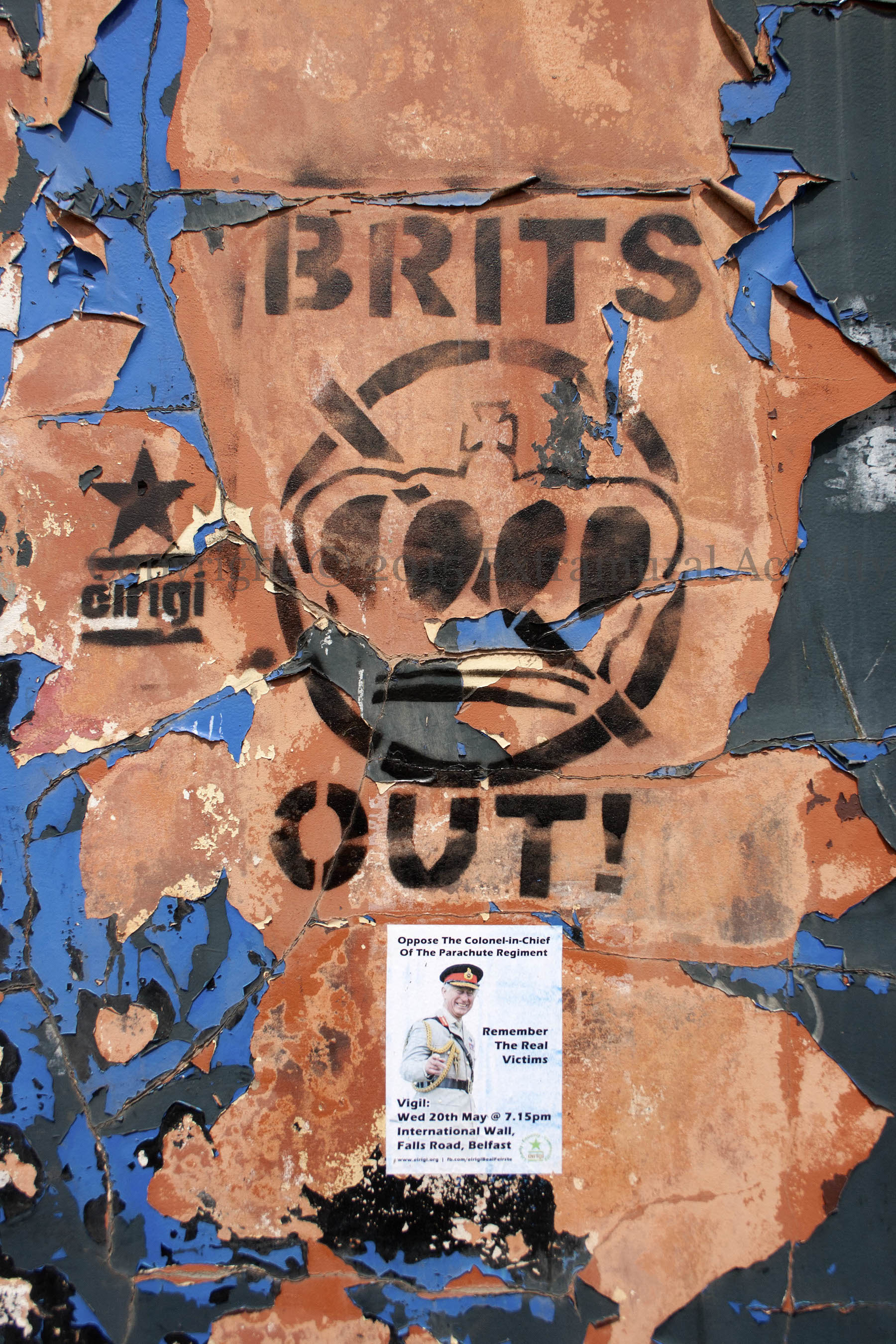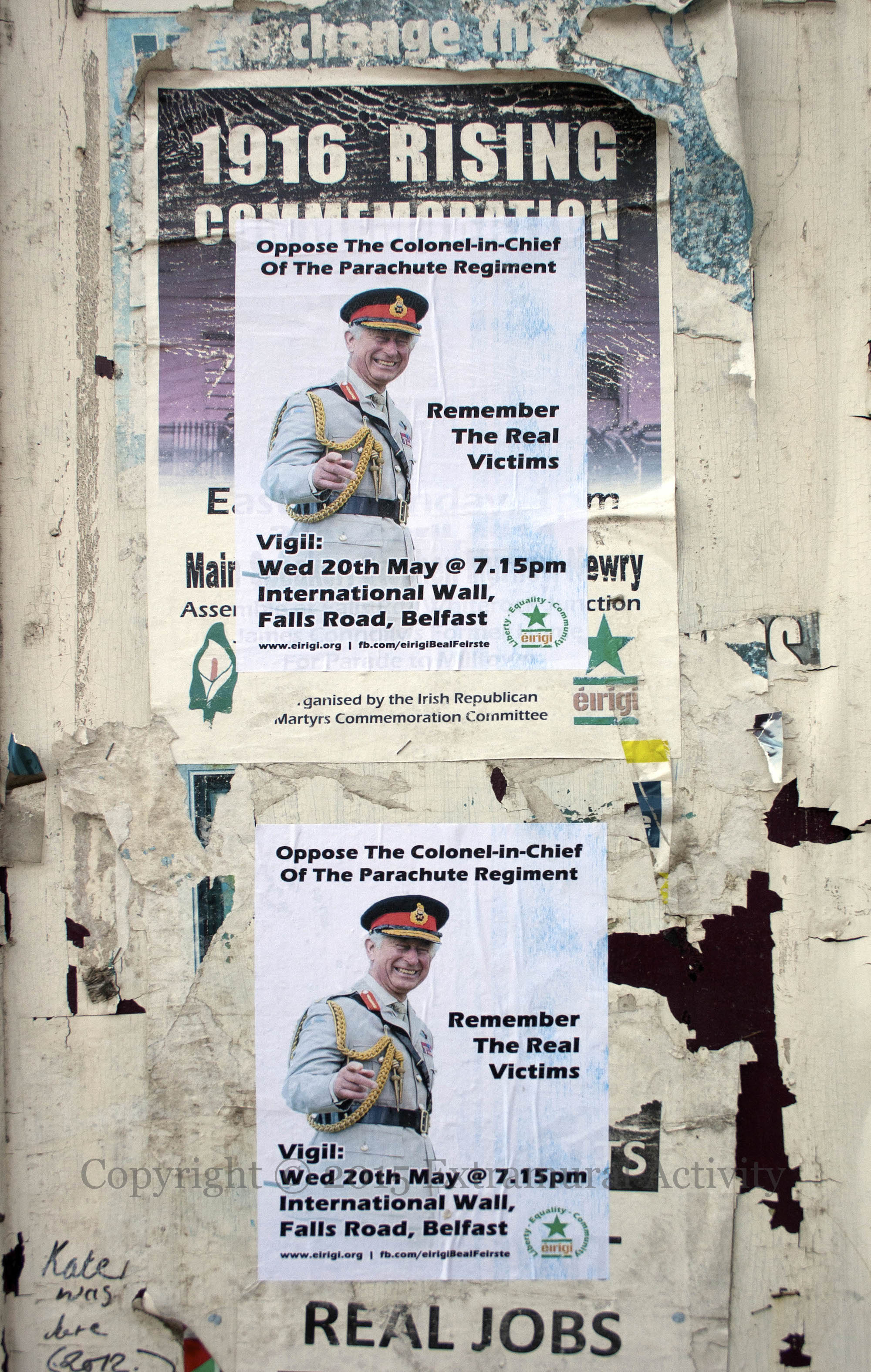 Charles, Prince Of Wales, Duke Of Rothesay, Duke Of Cornwall, and heir to the British throne, concludes a four-day visit to Ireland north and south today with a tour of Corrymeela peace and reconciliation centre. He is also colonel-in-chief of the Parachute Regiment (the Paras) which served in Northern Ireland from 1969 to 2007. Flyers have appeared protesting the visit (see the two images below), and The Rebels Rest on the Falls road is flying the banner shown above: “Fund communities, not royal visits – éırígí.org”. Éırígí also produced a video in memory of some of those killed by the Regiment during its time in Northern Ireland.