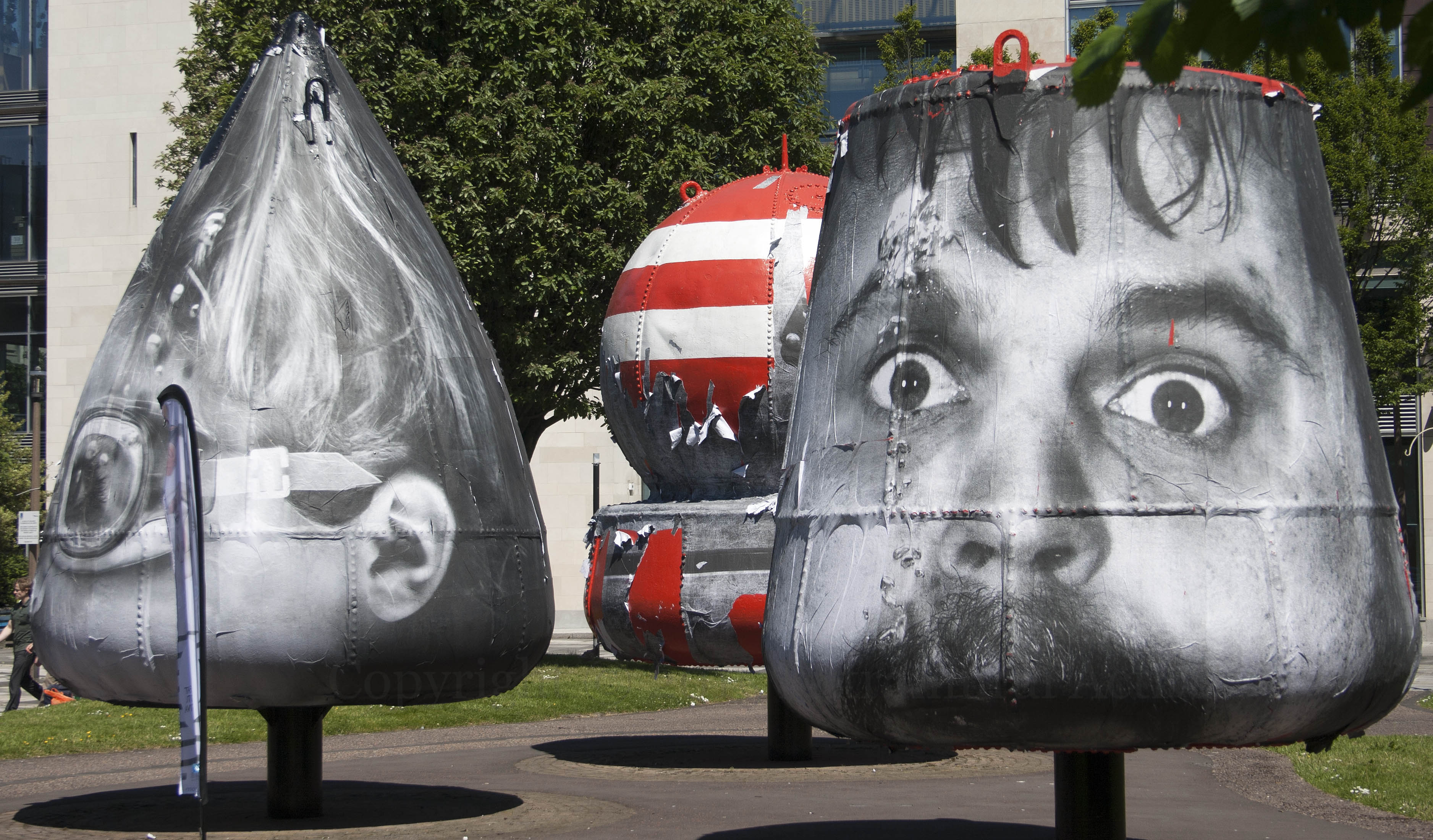 June brings the Belfast Photo Festival (4th-30th), including the work of Mentalgassi, a German trio that wraps street poles and other urban objects with black-and-white images of humans. In Belfast, they have covered the three buoys in the park beside the Art College. For shots of the buoys being covered, see the group’s Fb page.