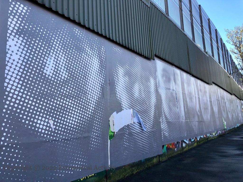 Here are two signs of protests at the NI Protocol along with the third version of graffiti complaining about parking spaces being taken by people working at the Boucher Road complexes. The original version (in 2020) threatened that “your car will be burnt” (Street View). It’s not clear whether it’s new construction or existing businesses that are the target, though the Boucher Road area has been busy, with a refit of B&Q (BelTel) and new Lidl being built next to the Olympia (BelTel) (not to mention the stage for the Ed Sheeran concerts (Newsletter)).