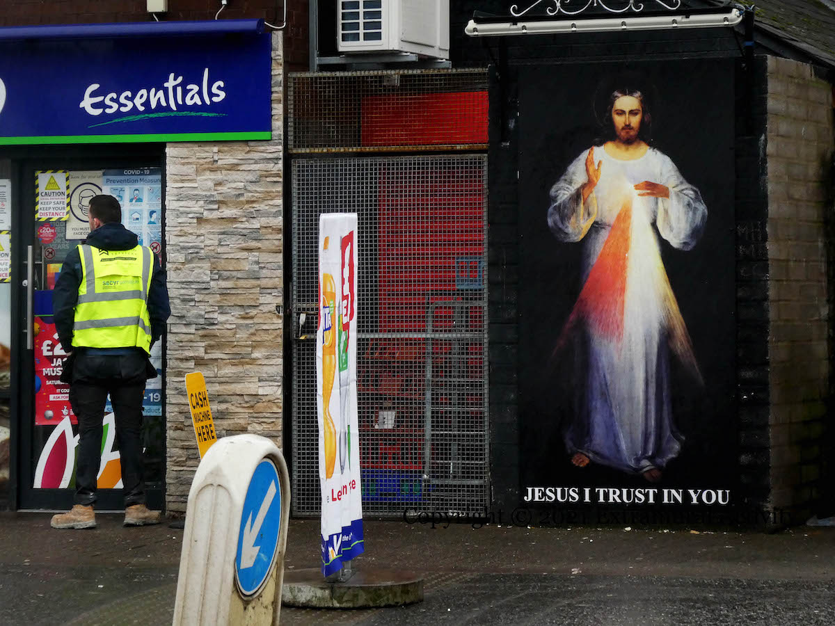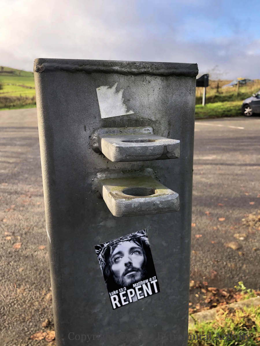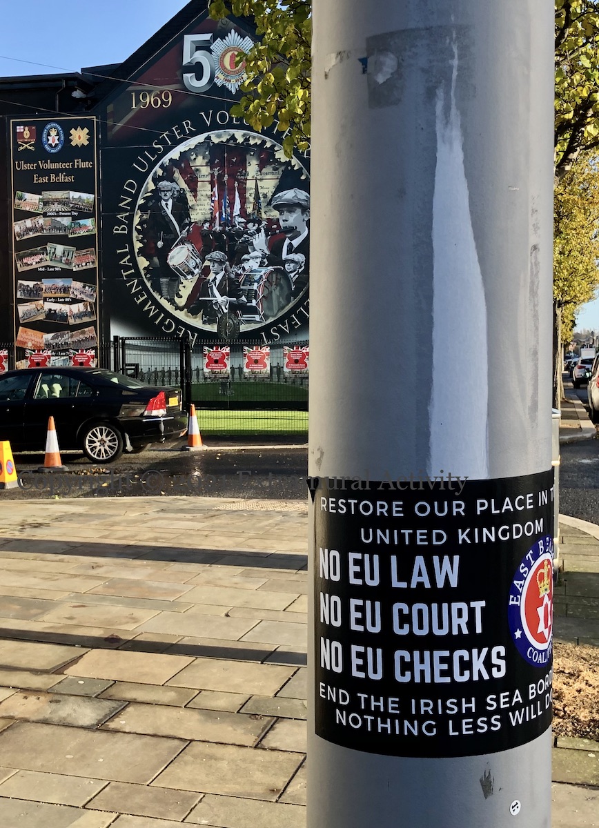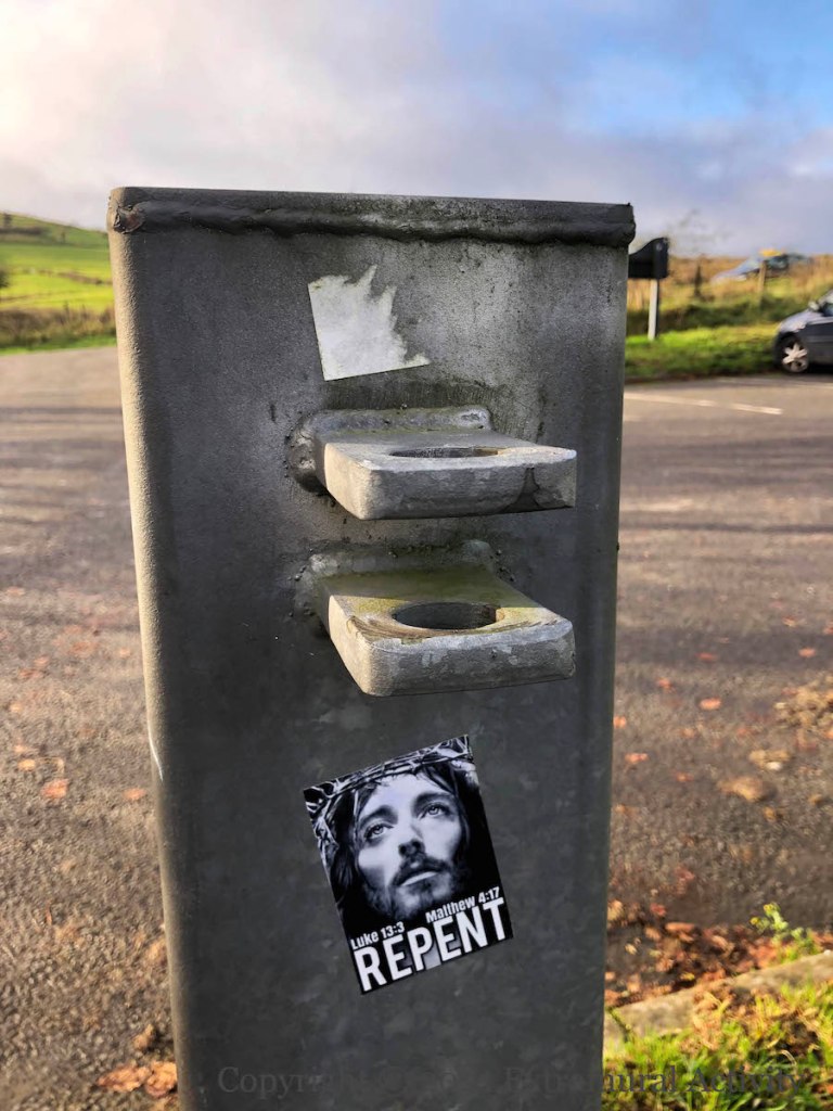 The cult of the Great Pumpkin seems to be spreading from the US but it’s not clear that in fact the Great Pumpkin loves unconditionally: in the Peanuts universe, Linus believes that on Halloween night the Great Pumpkin rises from the pumpkin patch and delivers toys to good and believing children (Peanuts wiki). Paste-up in Belfast city centre.