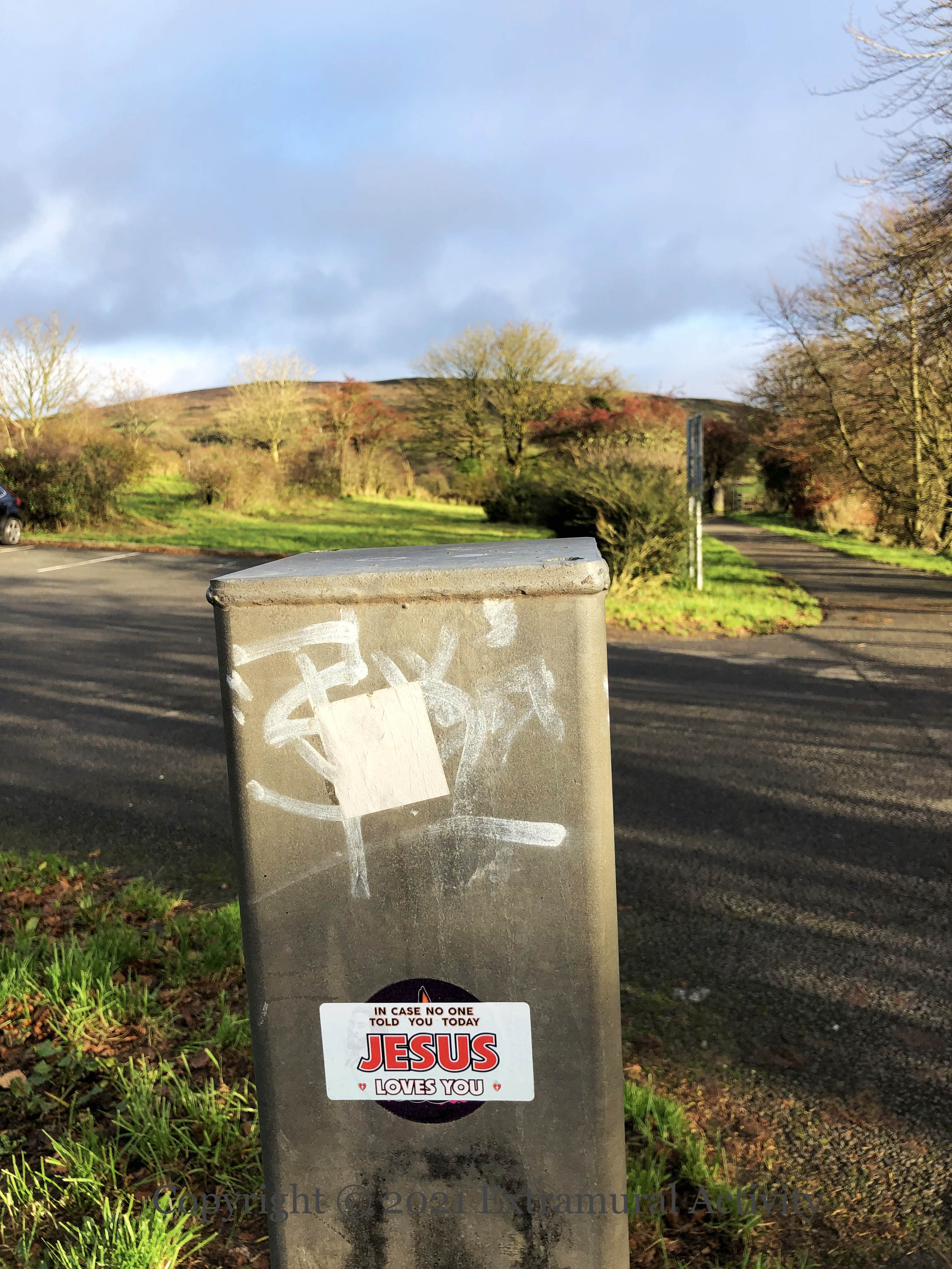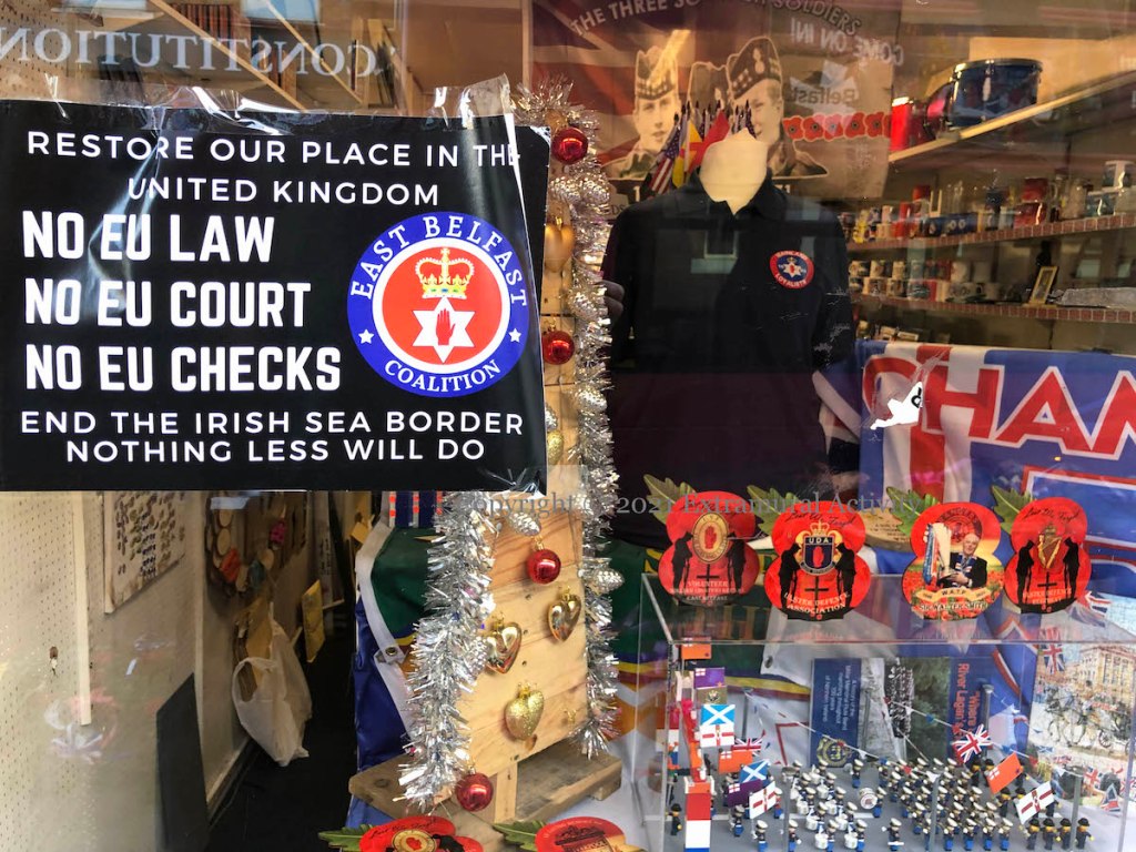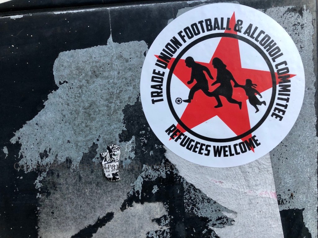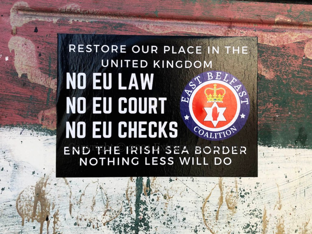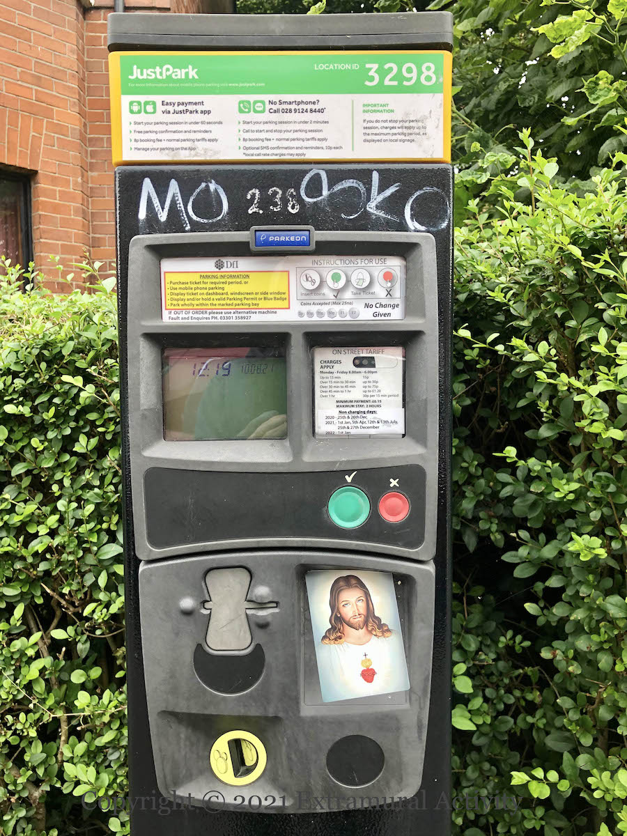 The cult of the Great Pumpkin seems to be spreading from the US but it’s not clear that in fact the Great Pumpkin loves unconditionally: in the Peanuts universe, Linus believes that on Halloween night the Great Pumpkin rises from the pumpkin patch and delivers toys to good and believing children (Peanuts wiki). Paste-up in Belfast city centre.