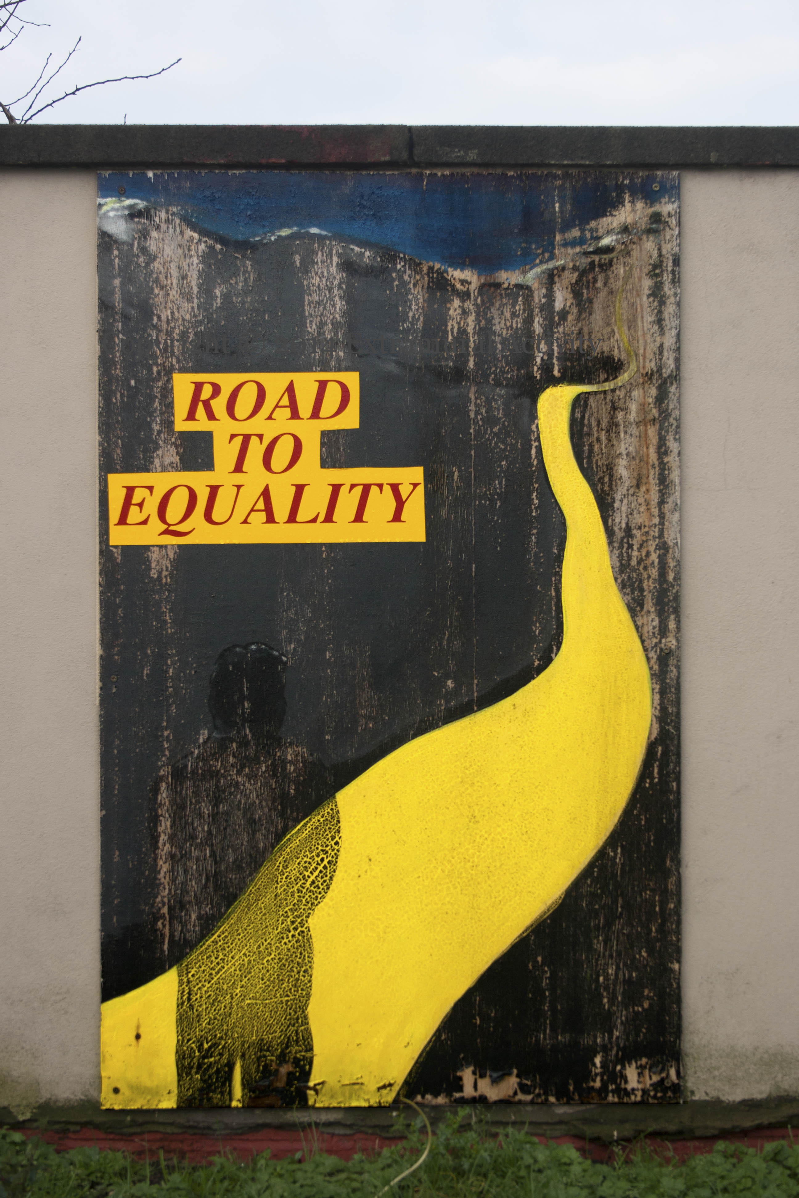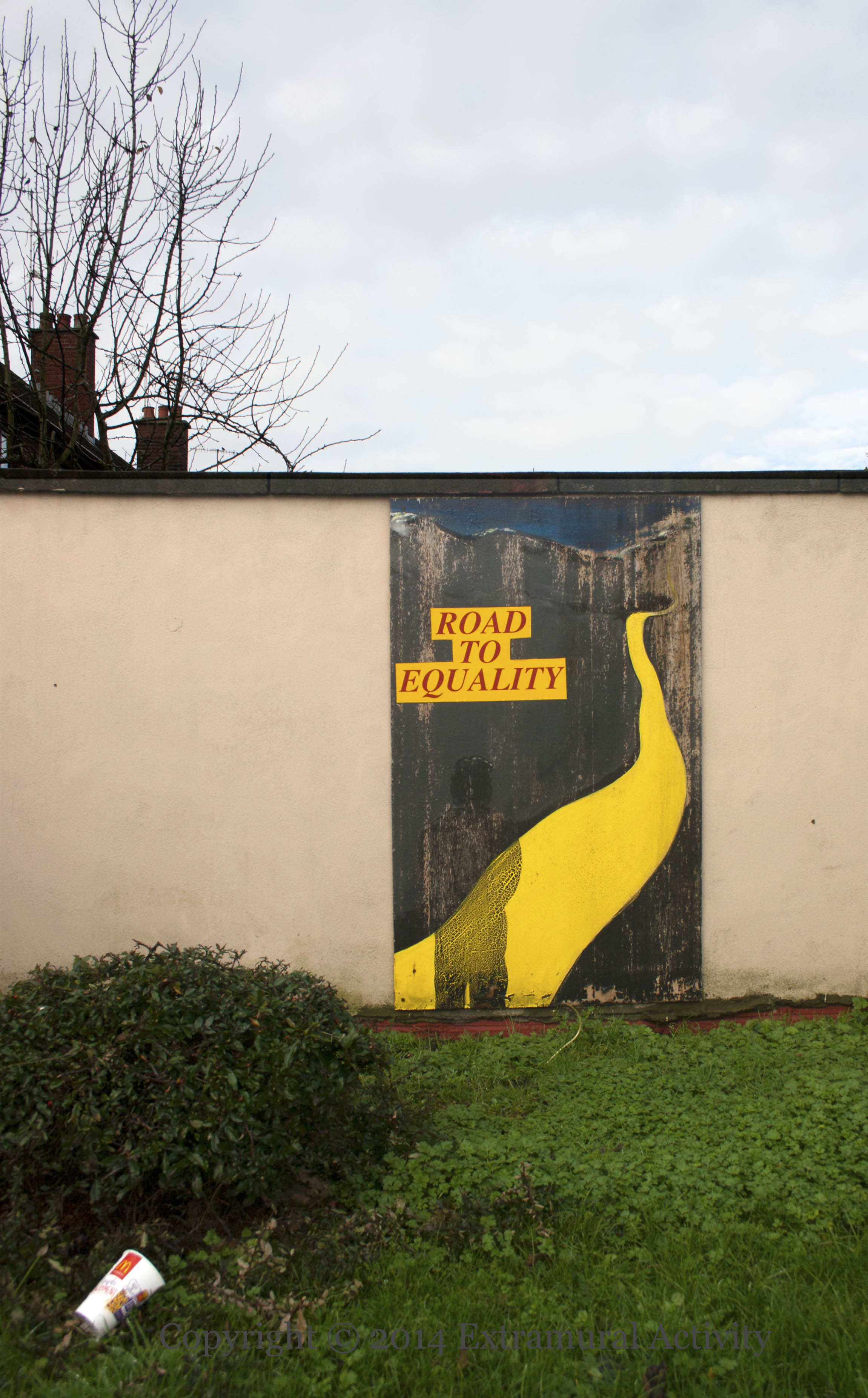 The road to equality is long and winding and goes through Andersonstown’s Derrin Pass. The junction is full of small board depicting Gaelic games, Irish culture, and landscape drawings, as well as exhortations towards equality — see the corresponding entry in the Peter Moloney Collection.