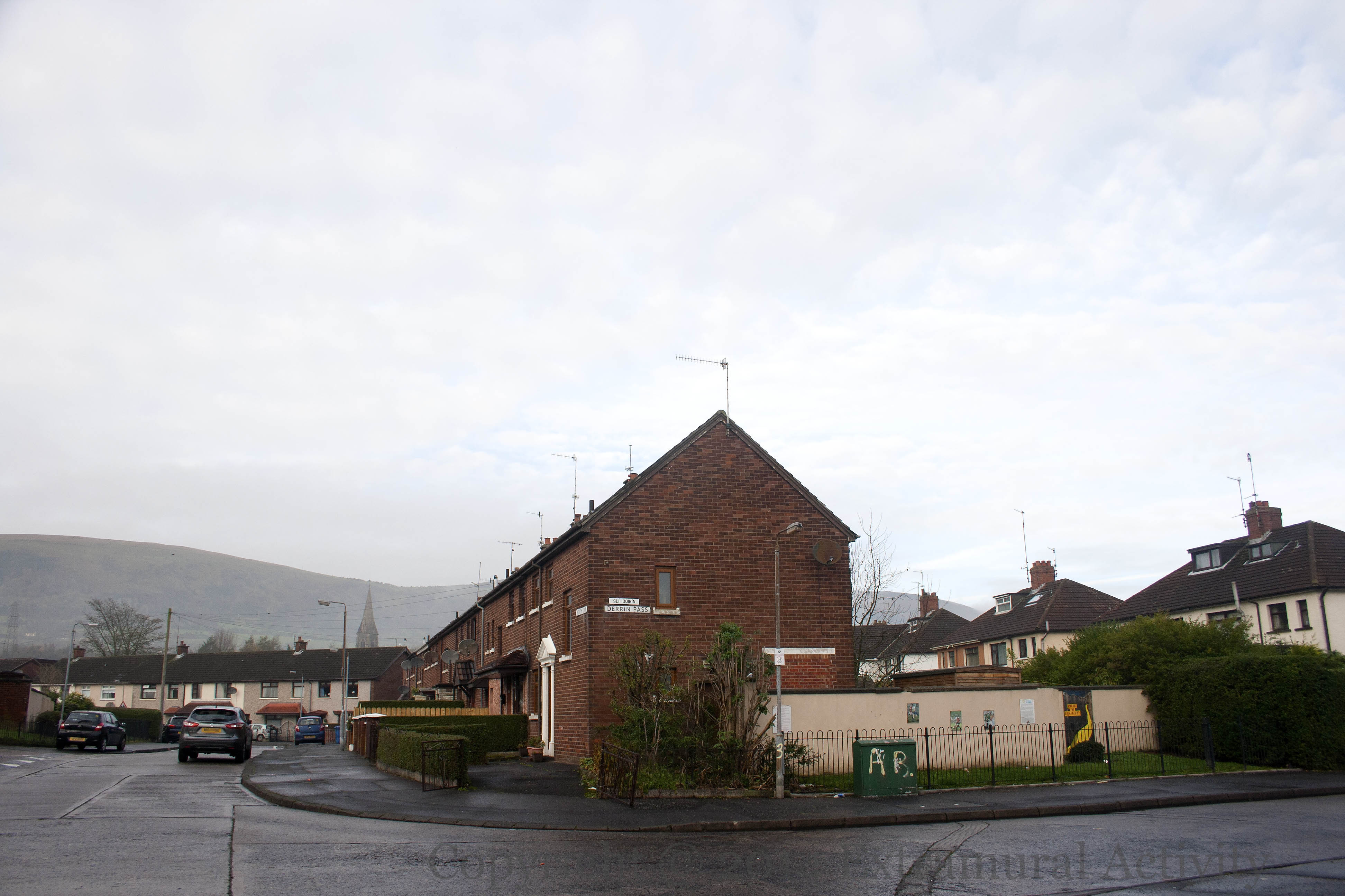 The old Tullygarley playground (mural site) with the Fountain in the foreground, and rows of houses on either side (Glynn Road and South Circular Road).