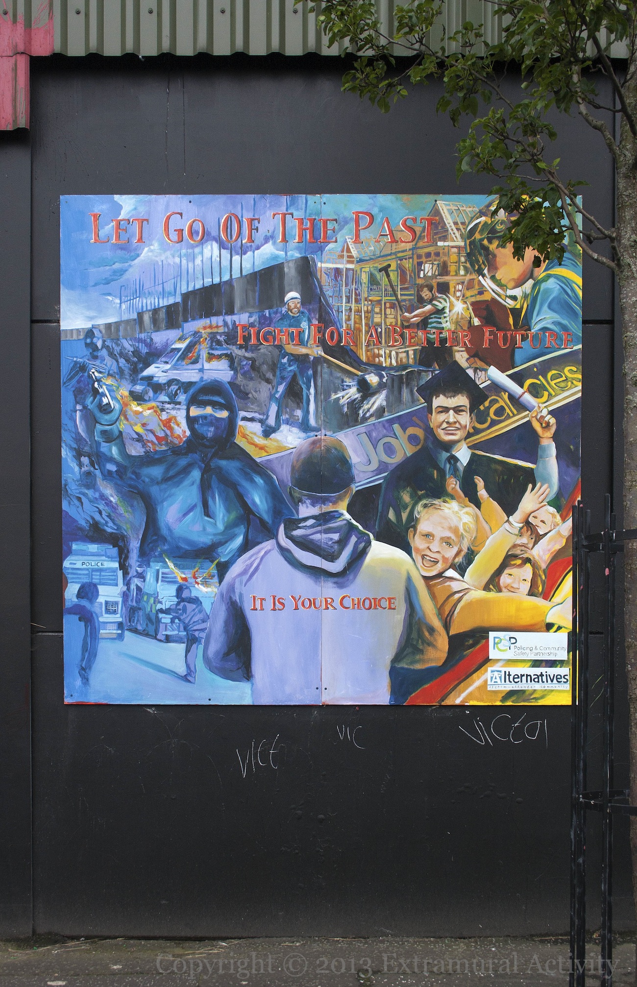 Board on the Cupar Way side of the “peace” line showing, on the left hand side, rioters with petrol bombs attacking the police, the “peace” line, and a burning vehicle, and, on the right, construction workers, university graduates, and happy children. “Fight for a better future. It is your choice.” For more information, see Daniela Balmaverde.