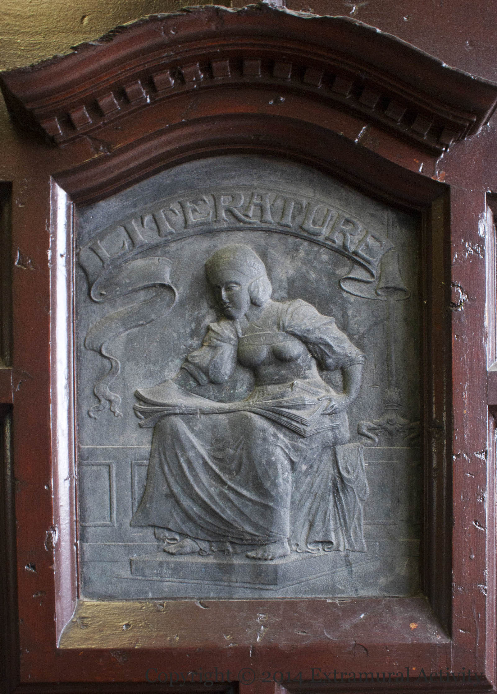 The Falls Road library is a ‘Carnegie Library’ (WP) – built with almost 4,000 pounds donated by Scotland-born American Andrew Carnegie. It opened on January 2nd, 1908, the second of three such libraries in Belfast, alongside Oldpark and Donegall Road. Its doors feature these two pieces by Holywood artist Rosamund Praeger: Art, seen here holding an artist’s palette – and Literature, seen below reading a folio. Art and Literature also take the form of angels, along with a third muse, Science, in the stonework above the doors.