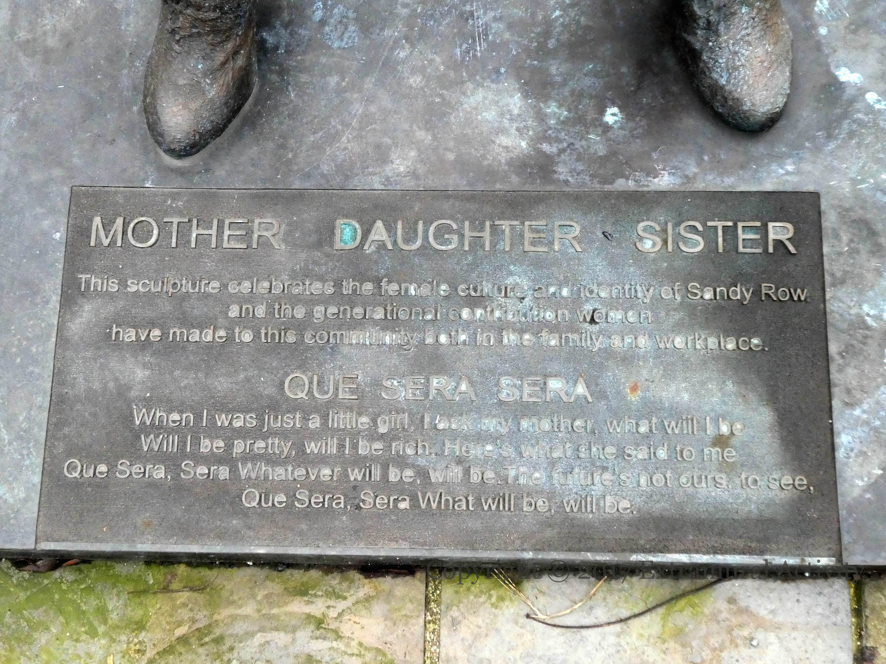 Ross Wilson’s statue ‘Mother – Daughter – Sister’ was launched in 2015 (Art Council NI), two years after his King William mural which towers over it (see final image). “This sculpture celebrates the female cultural identity of Sandy Row and the generational contribution women have made to this community both in the family and workplace.” With a verse from the Doris Day song ‘Que Sera Sera’ from Hitchcock’s The Man Who Knew Too Much.