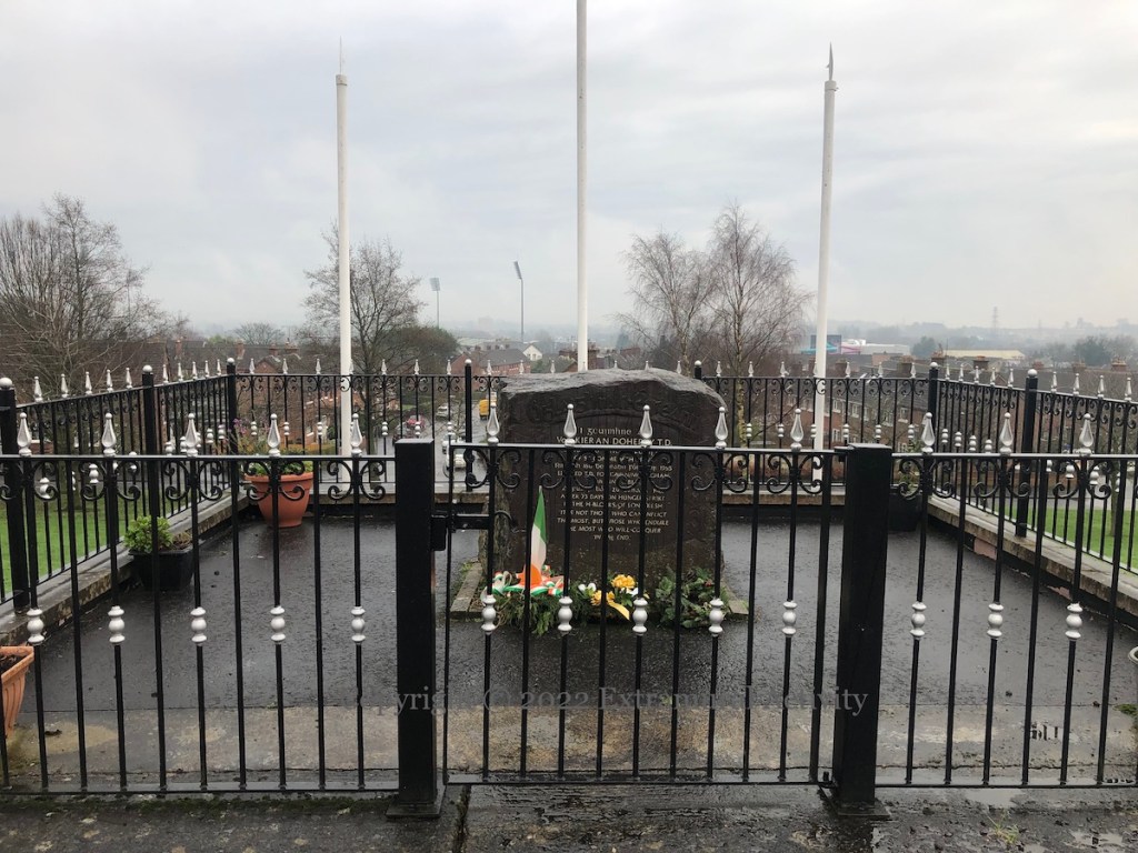 Edward Daly is most famous for waving a white handkerchief on Bloody Sunday, as a dying Jackie Duddy was carried away, but his devotion to the city of Derry spans decades: was a curate and then bishop in Derry from 1962 until 1993 (WP). ‘That’s a difficult question’ was his favourite saying (Derry Journal). The stone was erected after his death in 2016 (see The People’s Priest) and has now been incorporated into a garden of reflection.