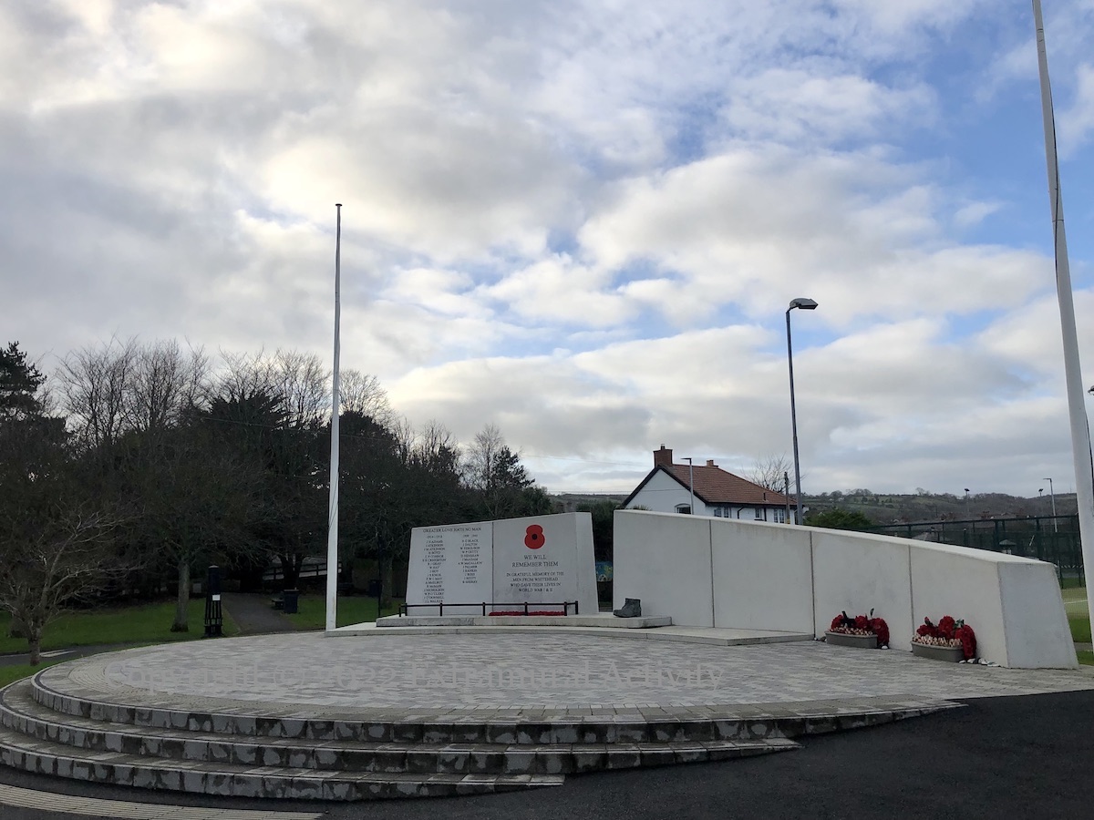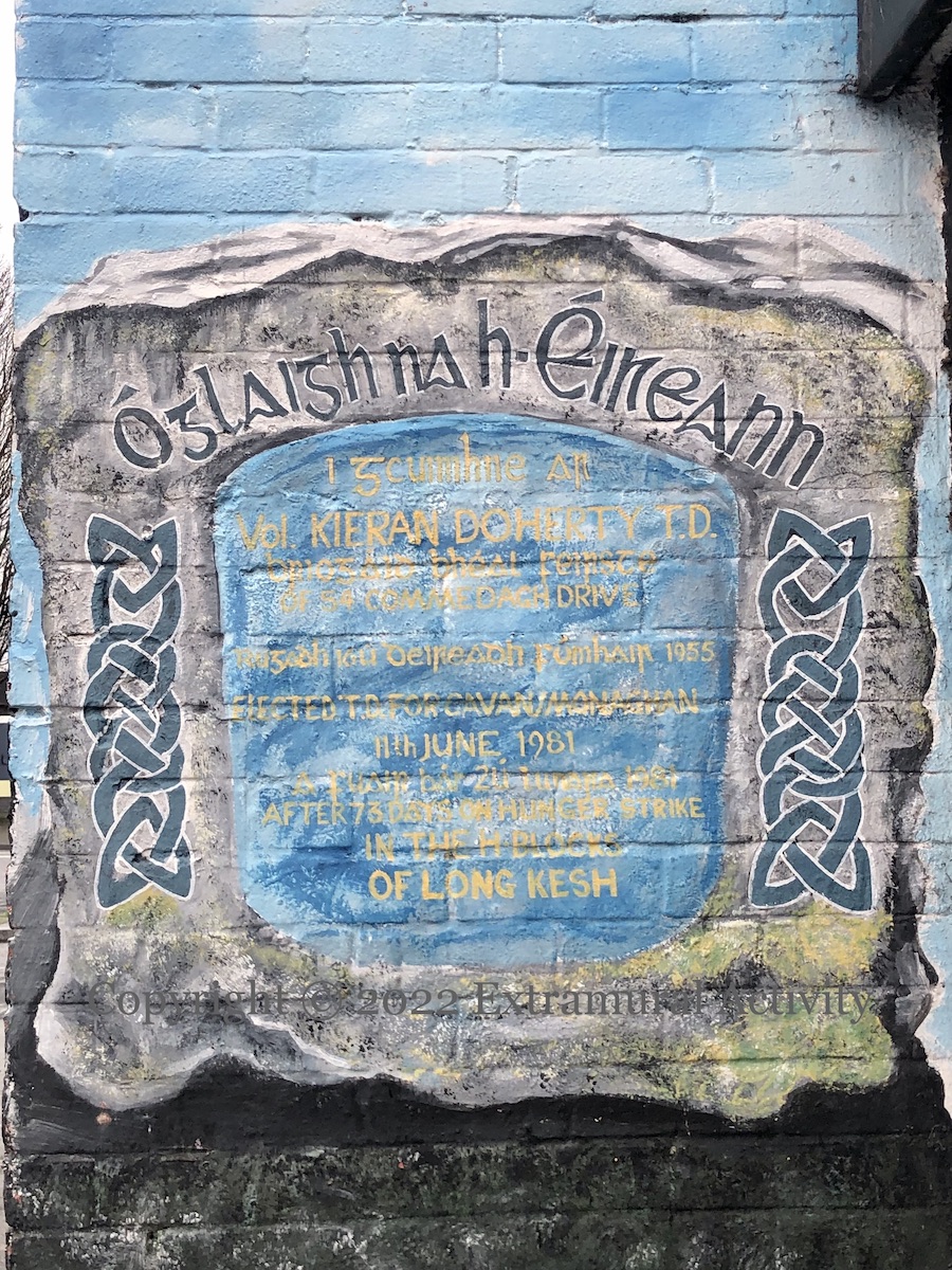 Edward Daly is most famous for waving a white handkerchief on Bloody Sunday, as a dying Jackie Duddy was carried away, but his devotion to the city of Derry spans decades: was a curate and then bishop in Derry from 1962 until 1993 (WP). ‘That’s a difficult question’ was his favourite saying (Derry Journal). The stone was erected after his death in 2016 (see The People’s Priest) and has now been incorporated into a garden of reflection.