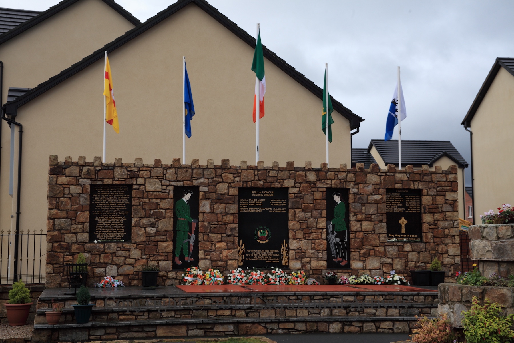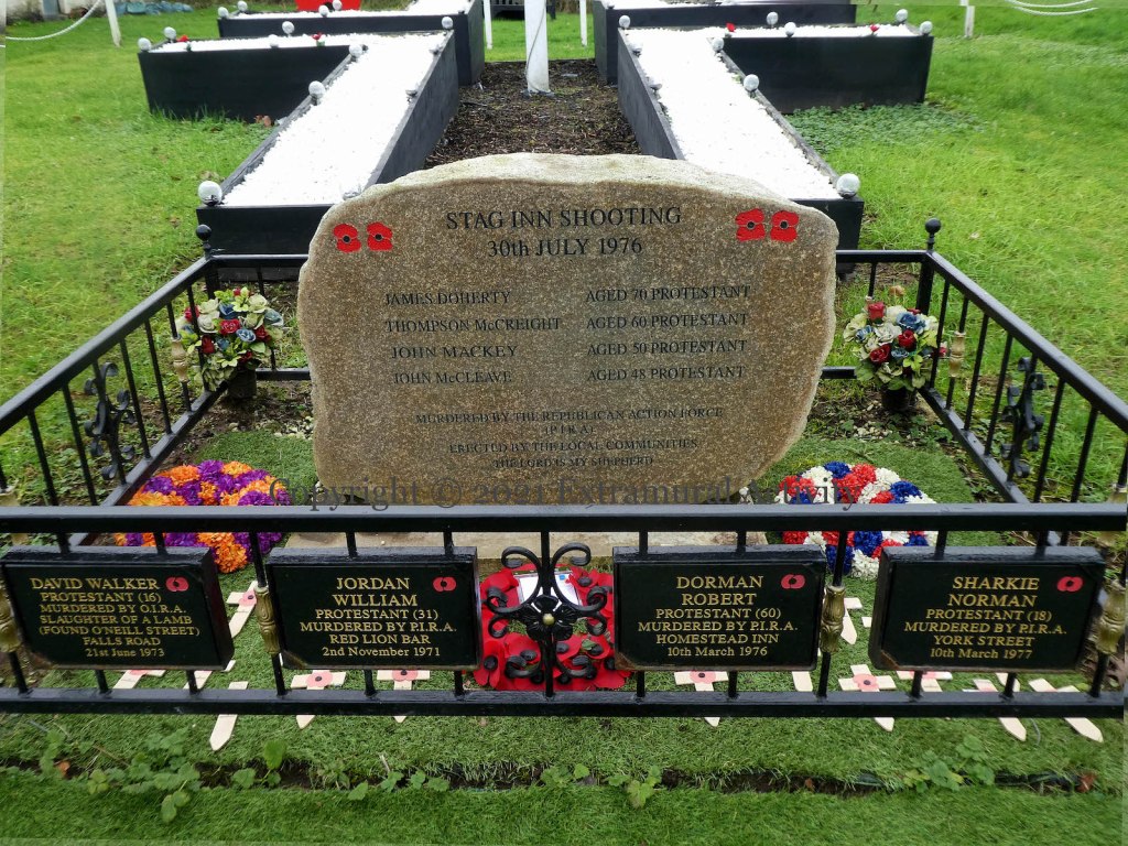 A long series of tit-for-tat shootings of pubs and clubs continued into the summer of 1976, with attacks on the Chlorane (June 5th), Walkers (June 25th), the Ramble (July 2nd), the Whitefort (July 29th), and then, on the 30th, The Stag at Shaws Bridge, Belfast, by the Republican Action Force (PIRA) (Sutton). John McCleave, John McKay, and James “Jimmy” Doherty died on the night of the attack, and Thompson McCreight died of his wounds nine days later. The memorial to them – “erected by the local communities” – is on Milltown Road, next to the Dreamscheme (web) mural.