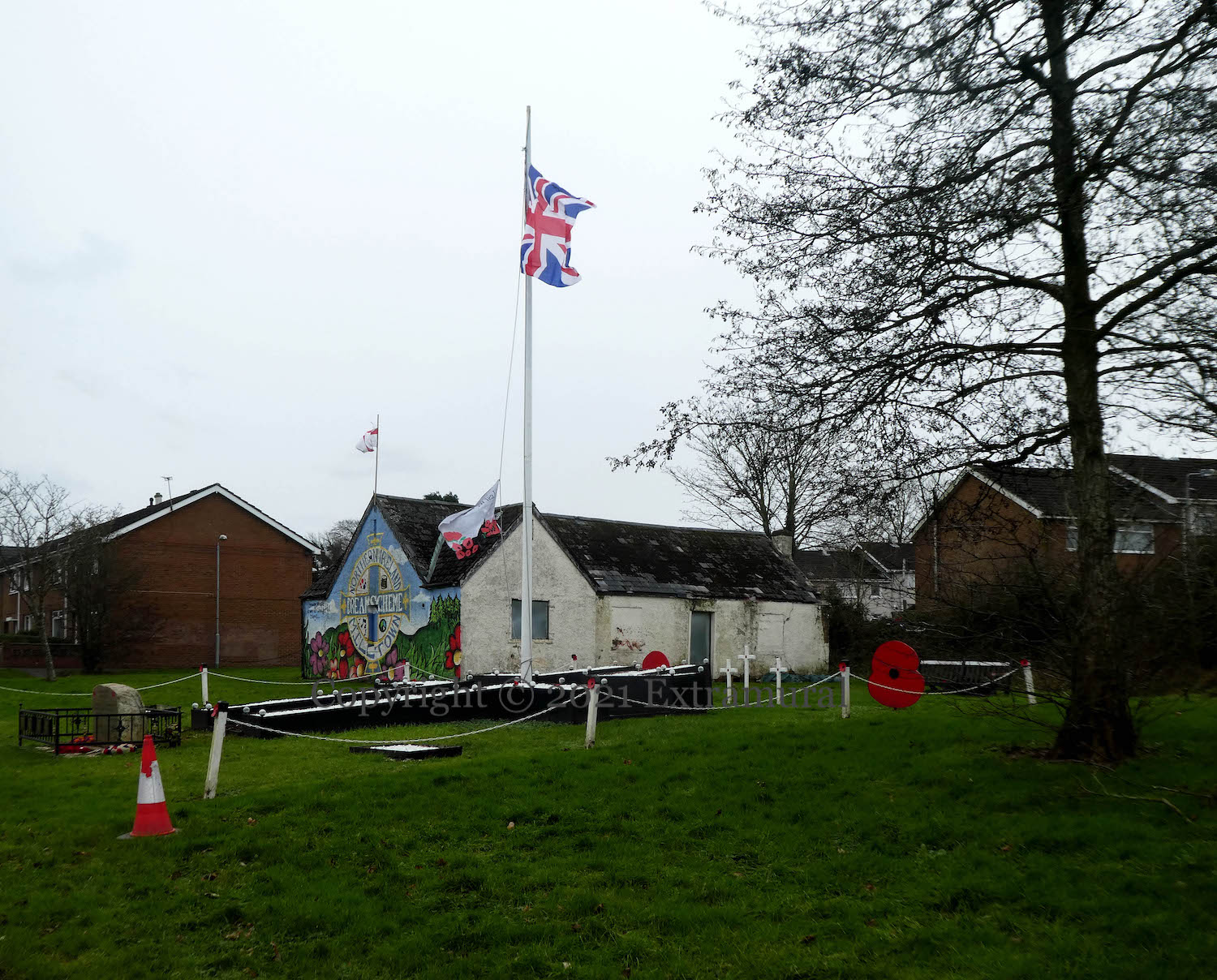 A long series of tit-for-tat shootings of pubs and clubs continued into the summer of 1976, with attacks on the Chlorane (June 5th), Walkers (June 25th), the Ramble (July 2nd), the Whitefort (July 29th), and then, on the 30th, The Stag at Shaws Bridge, Belfast, by the Republican Action Force (PIRA) (Sutton). John McCleave, John McKay, and James “Jimmy” Doherty died on the night of the attack, and Thompson McCreight died of his wounds nine days later. The memorial to them – “erected by the local communities” – is on Milltown Road, next to the Dreamscheme (web) mural.