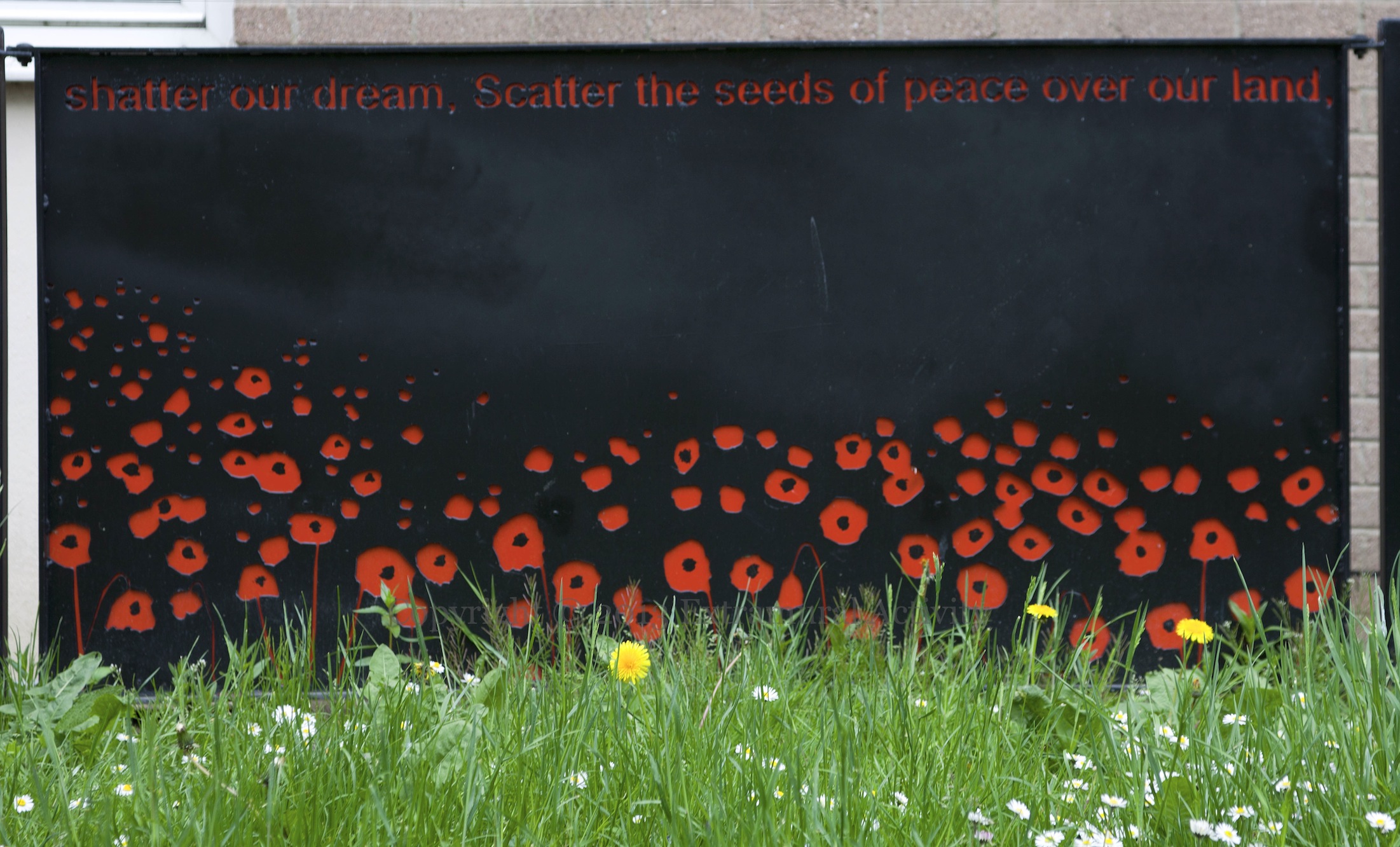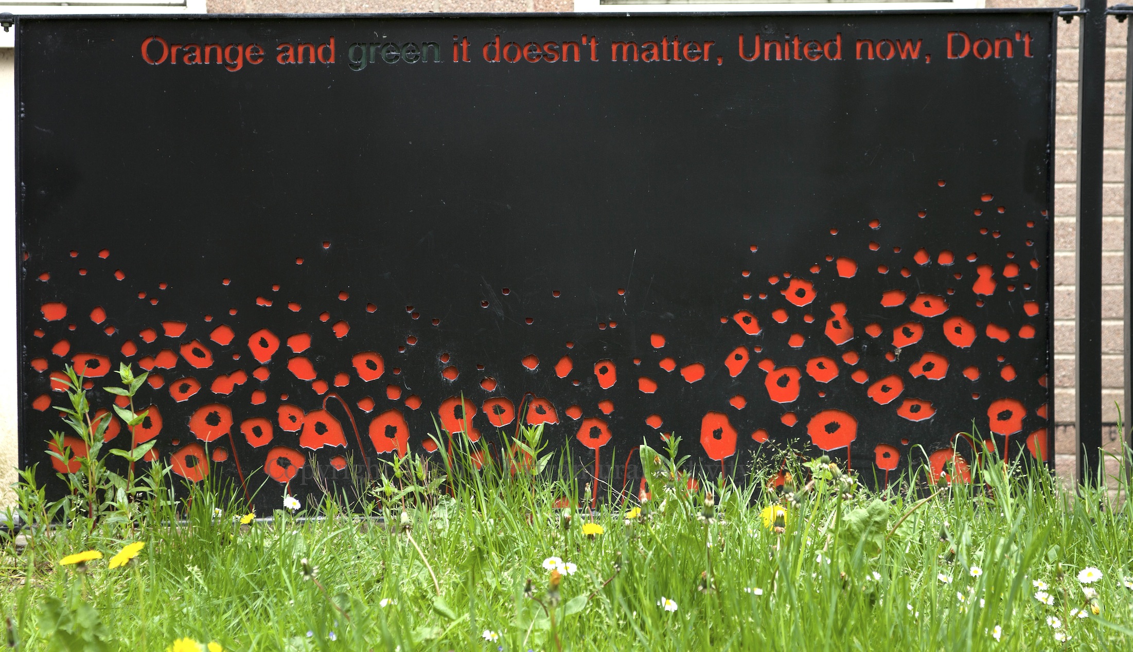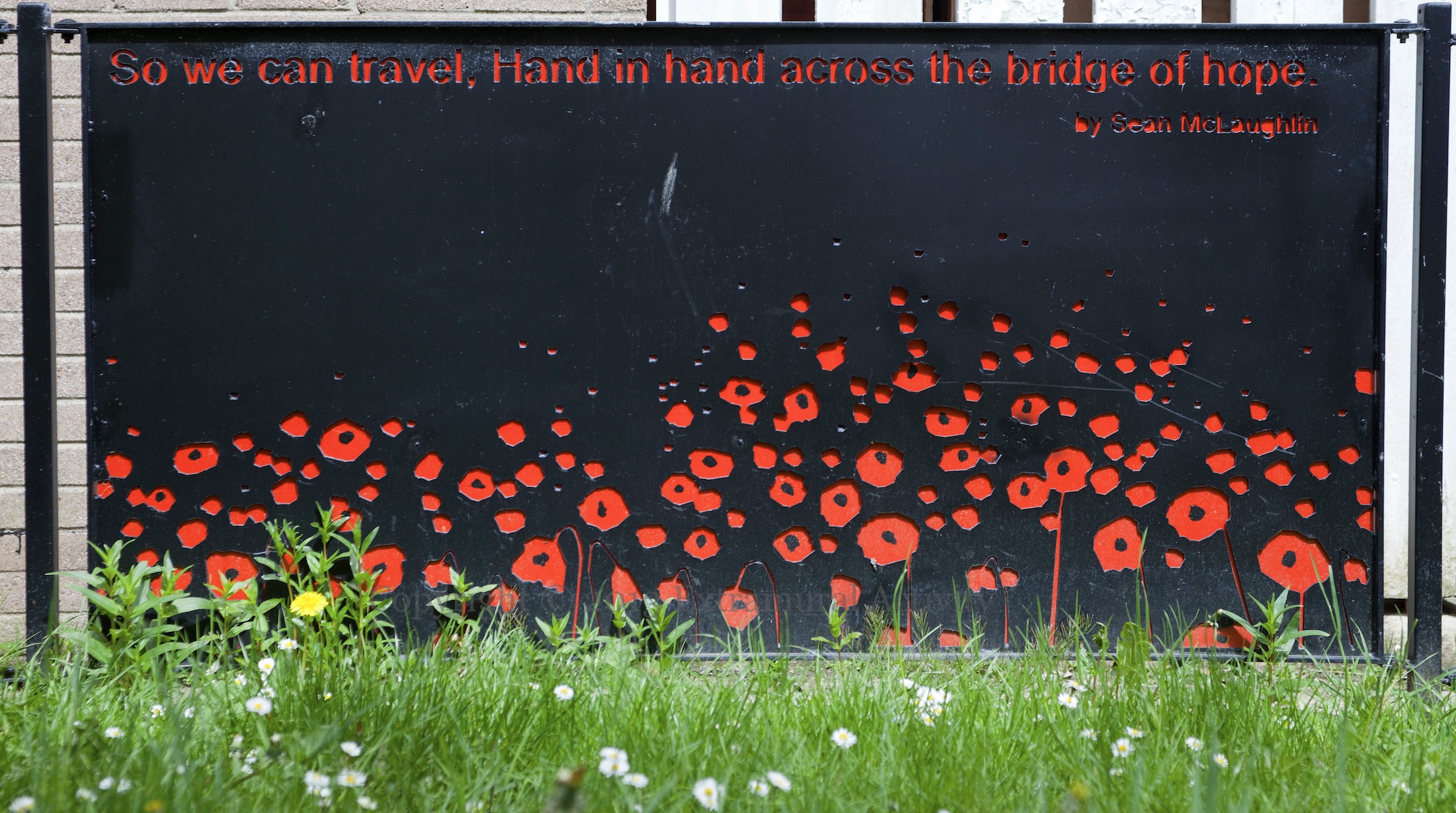 A three-piece stone in the same Tullycarnet garden as the war memorial and peace mural featured previously. “Orange and green it doesn’t matter, United now, Don’t shatter our dream, Scatter the seeds of peace over our land, So we can travel, Hand in hand across the bridge of hope.” by Sean McLaughlin, a twelve-year-old who was killed in the Omagh bombing of 1998 (WP). The garden was unveiled June 2010 (IFI).