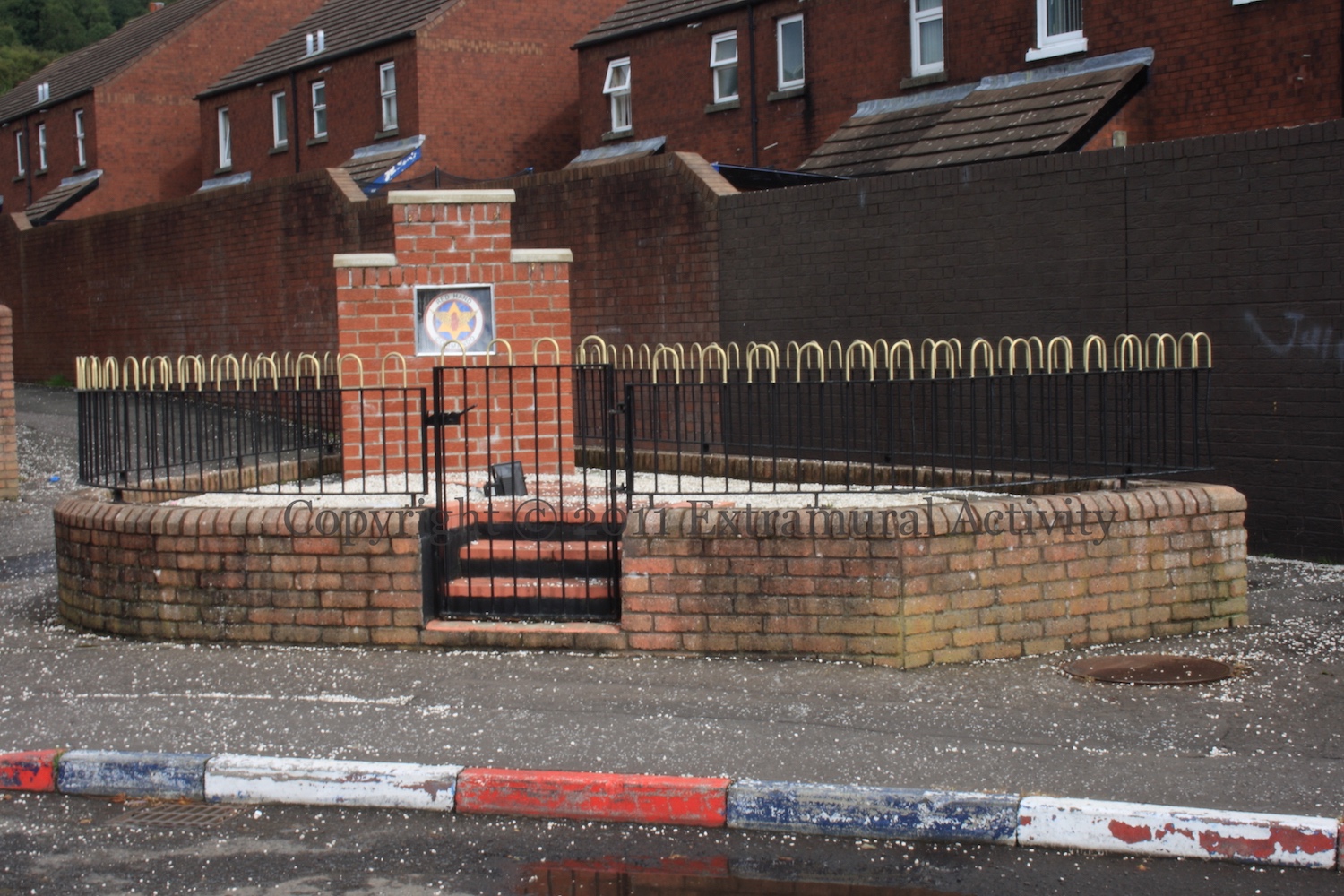 The nameplate on the lower corner of Northland Street now reads “Thiepval Street” and the Thiepval board above adorns the end wall (replacing an earlier mural to UVF A Company 5th platoon; the stone shown below, although not present in 2006, perhaps belongs to the era of the previous mural). On the other side of Conway Street is/was North Howard Walk where a plate now reads “Passchendaele Court“. It’s not clear whether the names have been changed officially or not. The names are unofficial (as of November 15th, 2012). In the New Lodge earlier this year (April-May, 2012), Fishers Court became McGurk’s Way (U.tv | BBC-NI).