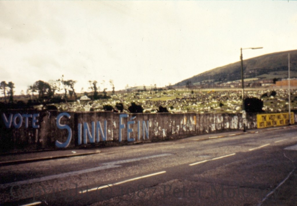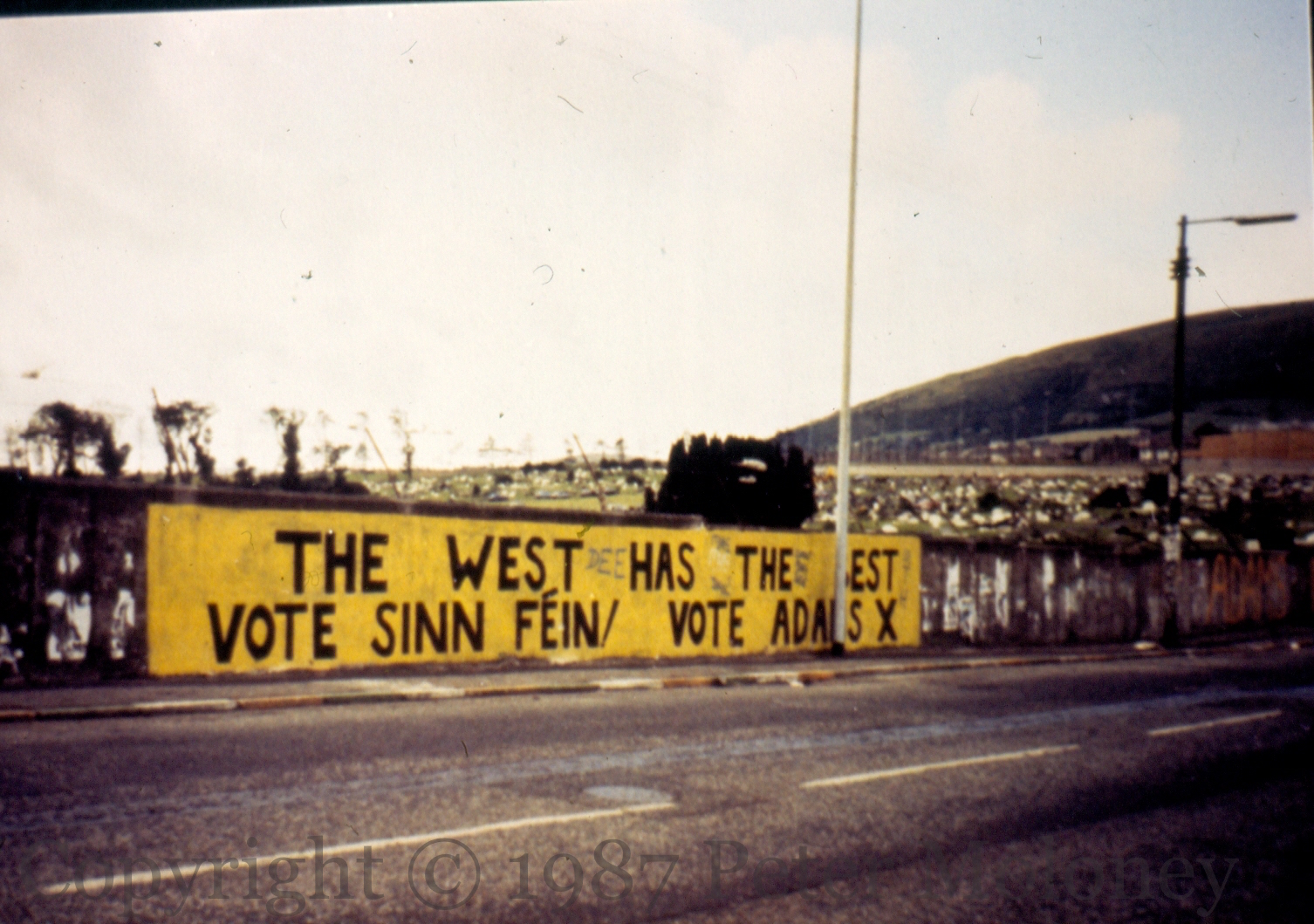 [Also from 1987, the Khomeini wall in Beechmount (see above) is replaced with “Vótáıl Sınn Féın – Adams” in extremely large letters (M00504).]