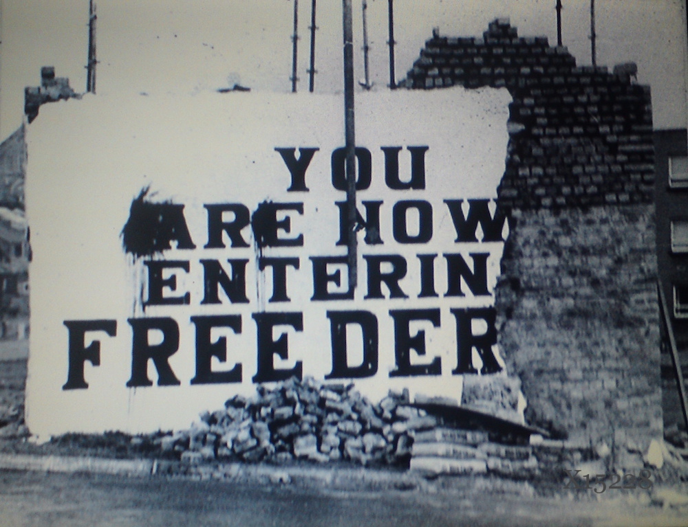 The whole wall, both front and back, was plastered and painted, thus providing two surfaces for messages. On the front, the slogan (“You Are Now Entering Free Derry”) was repainted in block capitals:
