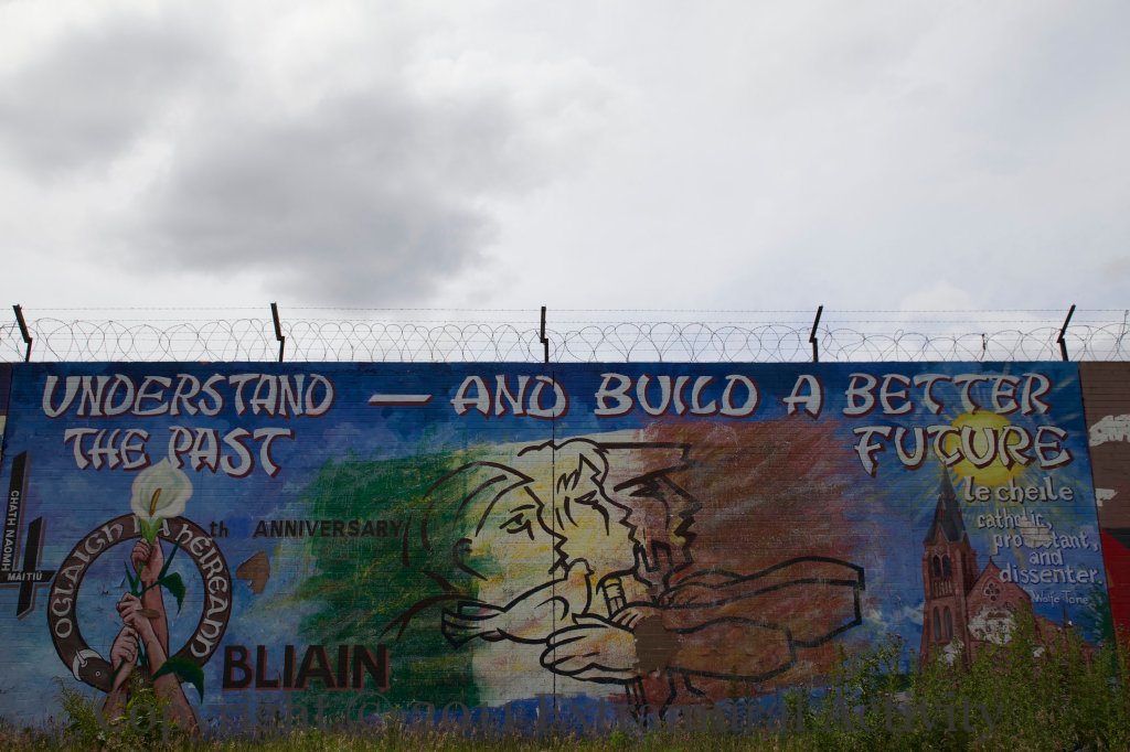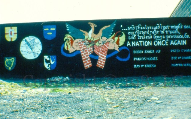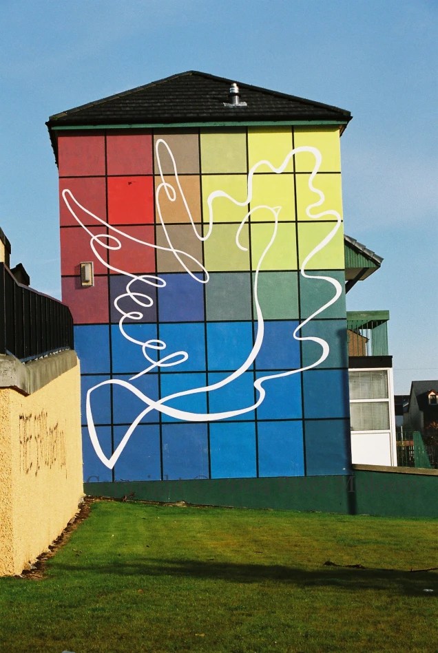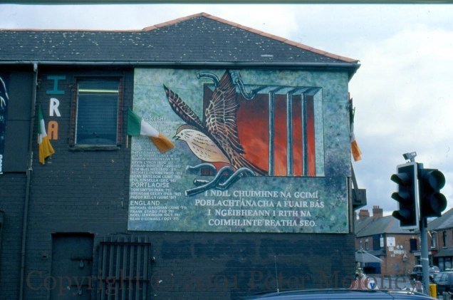 Doves are released by hands in the colours of humankind over the H Blocks – all the world wants peace, it seems. In contrast, the words say “Victory will be ours” (Beıdh an bua agaınn) and “We will be free”.