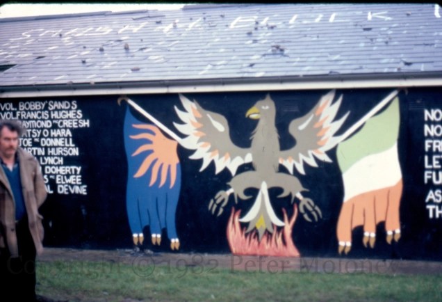 The phoenix in Anne Street, Derry (which has survived untouched since 1981) appears alongside the Tricolour, Starry Plough, and Sunburst flags.