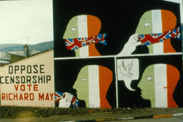 In this Springhill, west Belfast, mural, there’s no explicit reference to Sınn Féın, apart from the call to vote for their candidate, Richard May, in City Council elections. But the issue of “censorship” will immediately be understood as a reference to the Broadcasting Ban, put in place in 1988, disallowing Sınn Féın representatives from speaking in their own voice on television and radio. The dove emerging from the mouth of the tricoloured head speaks the language of peace – symbolised by the dove – suggesting that there is some for negotiation on the (violent) removal of British forces and administration.