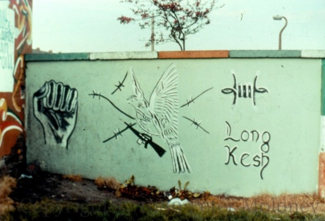 This dove, on the railings outside the IRSP/INLA offices on the Falls Road, takes the place that a lark traditionally would against a background of barbed wire. Where “saoırse” would previously have meant freedom from colonial oppression by means of violence (and the elevation of the Irish language), it now means that peace is the key to the freedom of prisoners – the dove holds the keys.