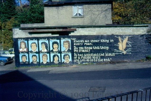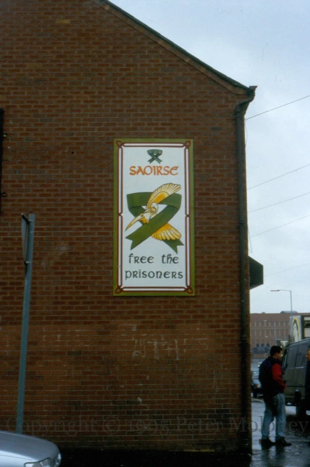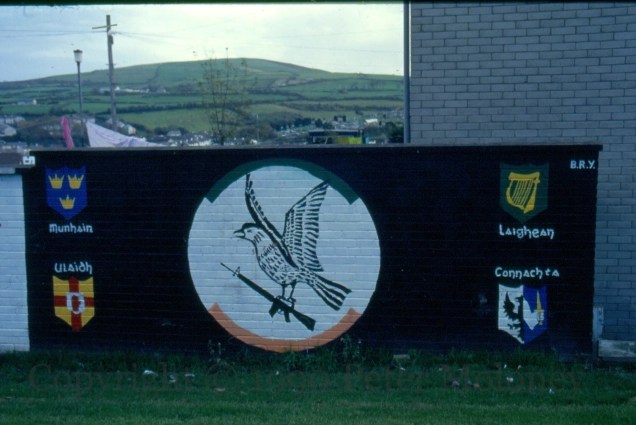 Thus, when the dove first appears in Sınn Féın murals – that is, in murals encouraging people to vote for Sınn Féın – and sometimes alongside the word “peace”, it indicates the beginning of a move away from the violence of the IRA and towards a political settlement. Sınn Féın and the IRA are often spoken of in one breath and in murals the Sınn Féın name or logo did sometimes appear in the context of militaristic imagery. But beginning in the late 80s, Sınn Féın and the political arm of republicanism is associated with the word “peace” and the image of the dove and is thus in tension with the militaristic murals which were so familiar up to that point. In other words, where previously political power had been a means of demonstrating support for the military campaign, it now included the suggestion of an end to the armed struggle. (Had this been foreseen, one might indeed have objected when Danny Morrison said, “Who here really believes we can win the war through the ballot box? But will anyone here object if, with a ballot paper in this hand and an Armalite in the other, we take power in Ireland?”) In short, the promise of peace gradually (from 1989 to 1994) put the armed struggle into second place.