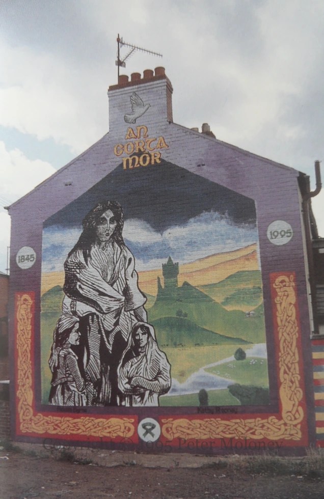 This is a Great Hunger mural (An Gorta Mór) but its ancillary symbols are a reflection of its time: at the top, a dove; at the bottom, a green ribbon, symbol of the campaign to release political prisoners. (For more on the green ribbon campaign, see Visual History 07.)