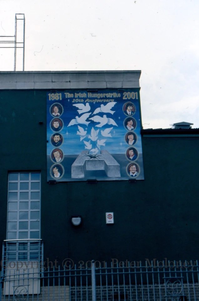 As a pointed example of the switch away from the dove when associated with the hunger strikers (see the Ballagh piece, above), we note that the original Mickey Devine mural (circa 2002) near his sister’s in Rathkeele, Derry, involved a dove …
