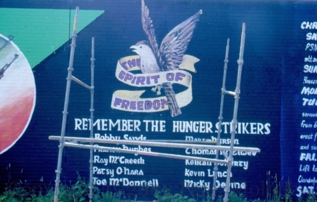 The phoenix in Clowney Street (Belfast) was first painted in 1981 and persists to the present day. (See The Oldest Murals for its history.) Here is represents the struggle of both “the people” and the 1981 hunger strikers.