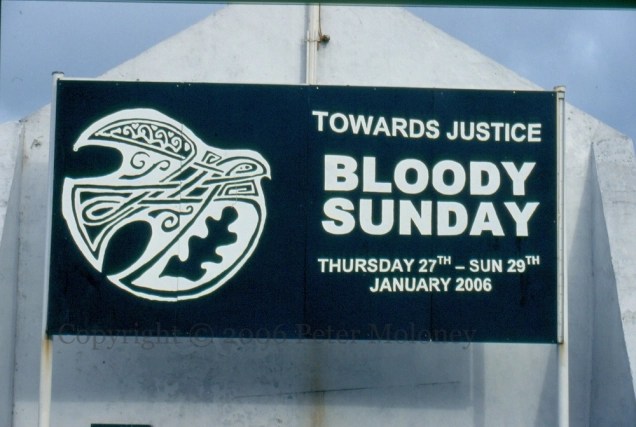 The dove was incorporated into the official symbol for Bloody Sunday, an abstract dove in Celtic knotwork, including the oak leaf as a symbol of Derry. Here are three images, one from before and two from after the peace process.